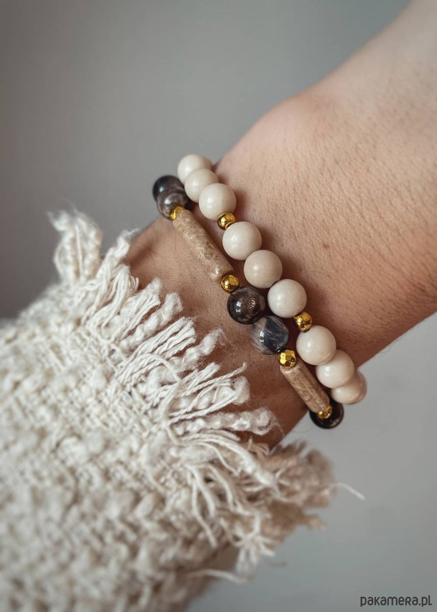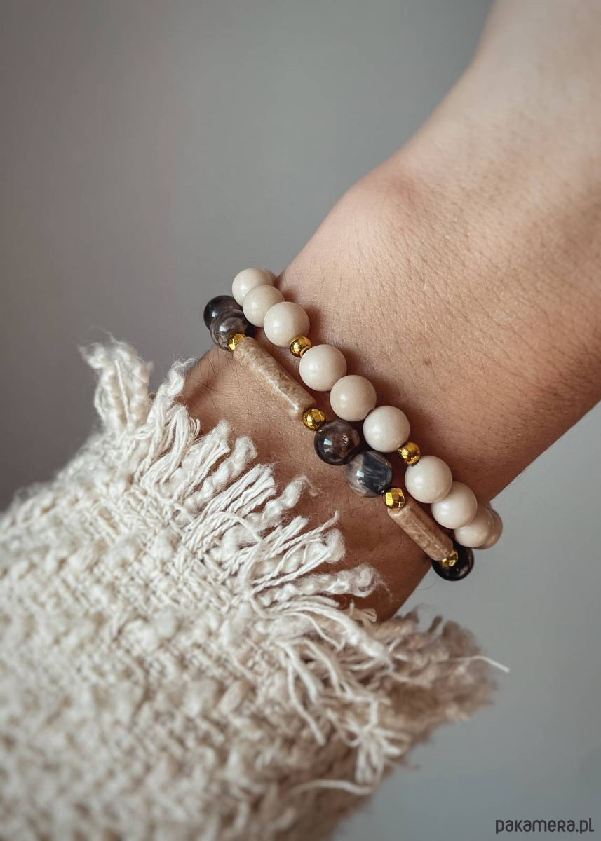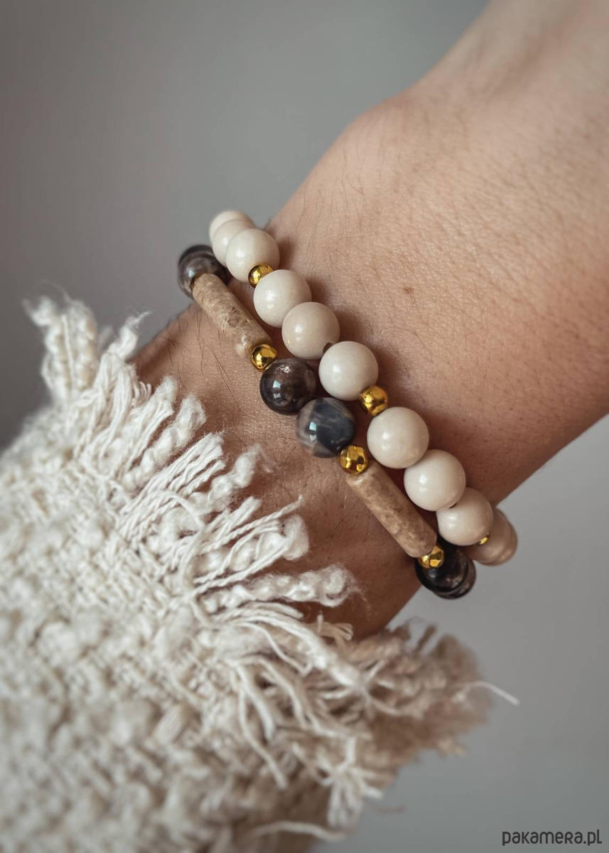 Bransoletki wykonane z kamieni naturalnych - Kamienia Słonecznego, Jaspisu. Można nosić je razem lub dowolnie mieszać - wszystko zależy od Ciebie! Ich cudowne odcienie nude z nutą czerni doskonale komponować się będą z każdym oufitem.