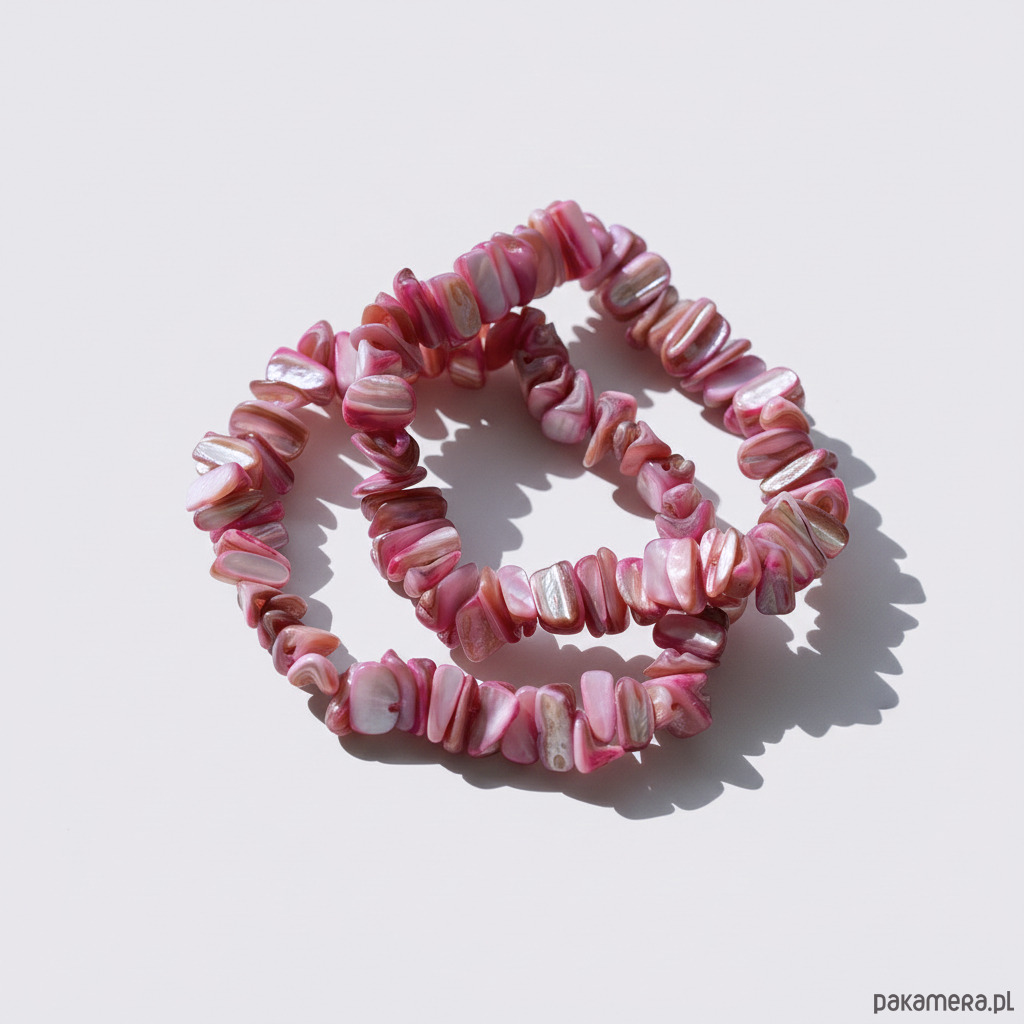 Ten zestaw dwóch bransoletek w kolorze różowym z masy perłowej to kwintesencja delikatności i subtelnej elegancji. Ich perłowy połysk pięknie odbija światło, podkreślając złożone wzory i tekstury każdego z koralików.