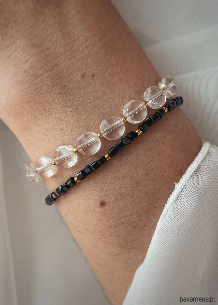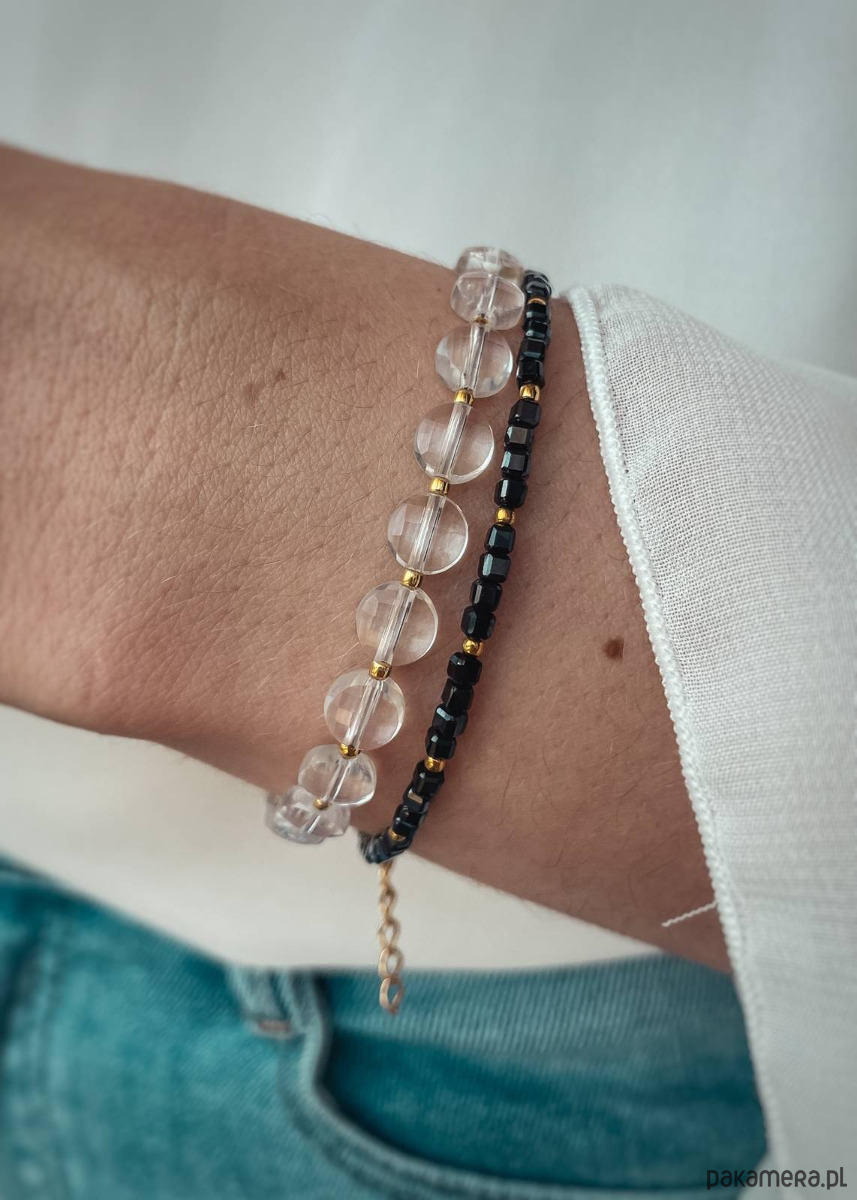 Zestaw Dwóch Bransoletek z zapięciem stworzonych z kamieni naturalnych.Pierwsza bransoletka stworzona została z Kryształów Górskich (kształt: dysk, wielkość: ok. 6 mm) oraz Hematytu w kolorze złotym (kształt: kulka, wielkość: ok. 2 mm). Druga bransoletka stworzona jest ze Spineli w kształcie drobnej kostki oraz Hematytu w kolorze złotym.Połączenie oryginalnych kamieni sprawia, że bransoletki są najwyższej jakości. Całość wykonywana jest własnoręcznie. Bransoletki urozmaicą każdą stylizację, dodadzą jej koloru i elegancji. Do wyboru trzy rozmiary: 15, 16, 17 cm. Do każdej bransoletki dodawana jest również przedłużka o długości ok. 3 cm.