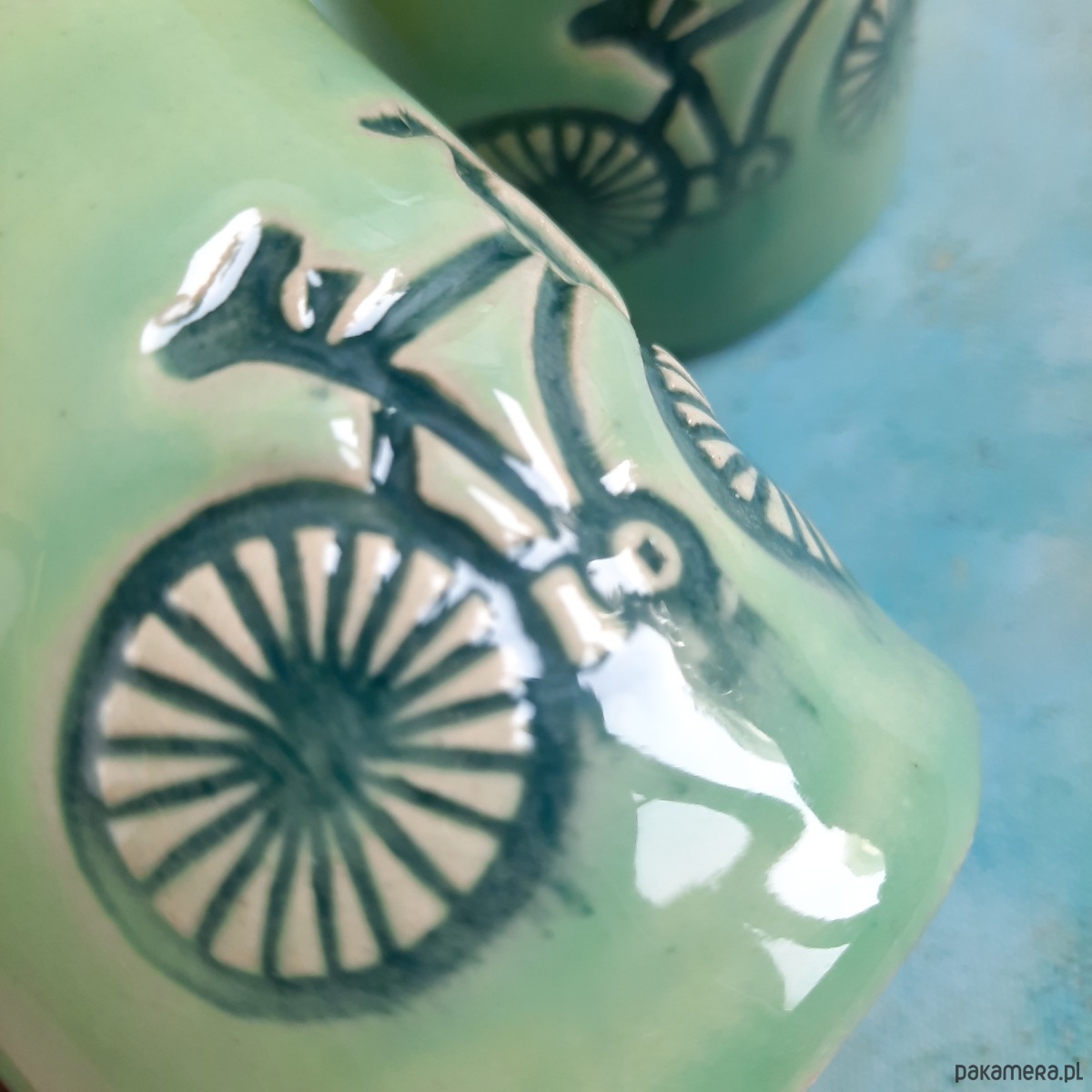 Delikatna, miętowo-zielona glazura w połączeniu z ciepłym, miodowym wykończeniem przy krawędzi tworzy świeży, pogodny efekt. Subtelnie wkomponowany motyw roweru dodaje lekkości i nawiązuje do swobody, podróży oraz codziennych małych przygód.