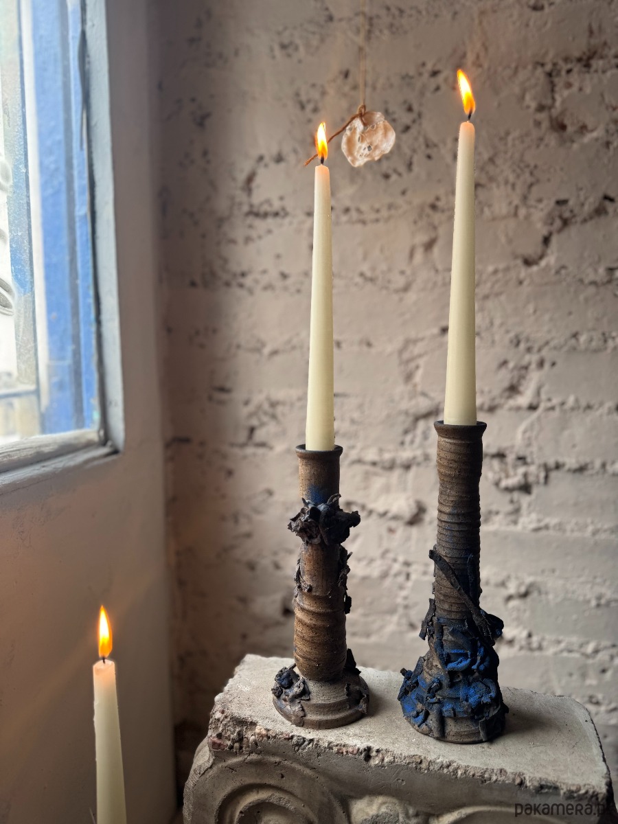 Każdy świecznik jest inny, a razem tworzą spójną, choć nieidentyczną parę. Zestaw wprowadza do wnętrza atmosferę ciszy, czasu i opowieści zapisanej w materii. Światło świecy wydobywa nieregularności powierzchni, podkreślając ich rzeźbiarski charakter i nadając całości spokojny, kontemplacyjny rytm.