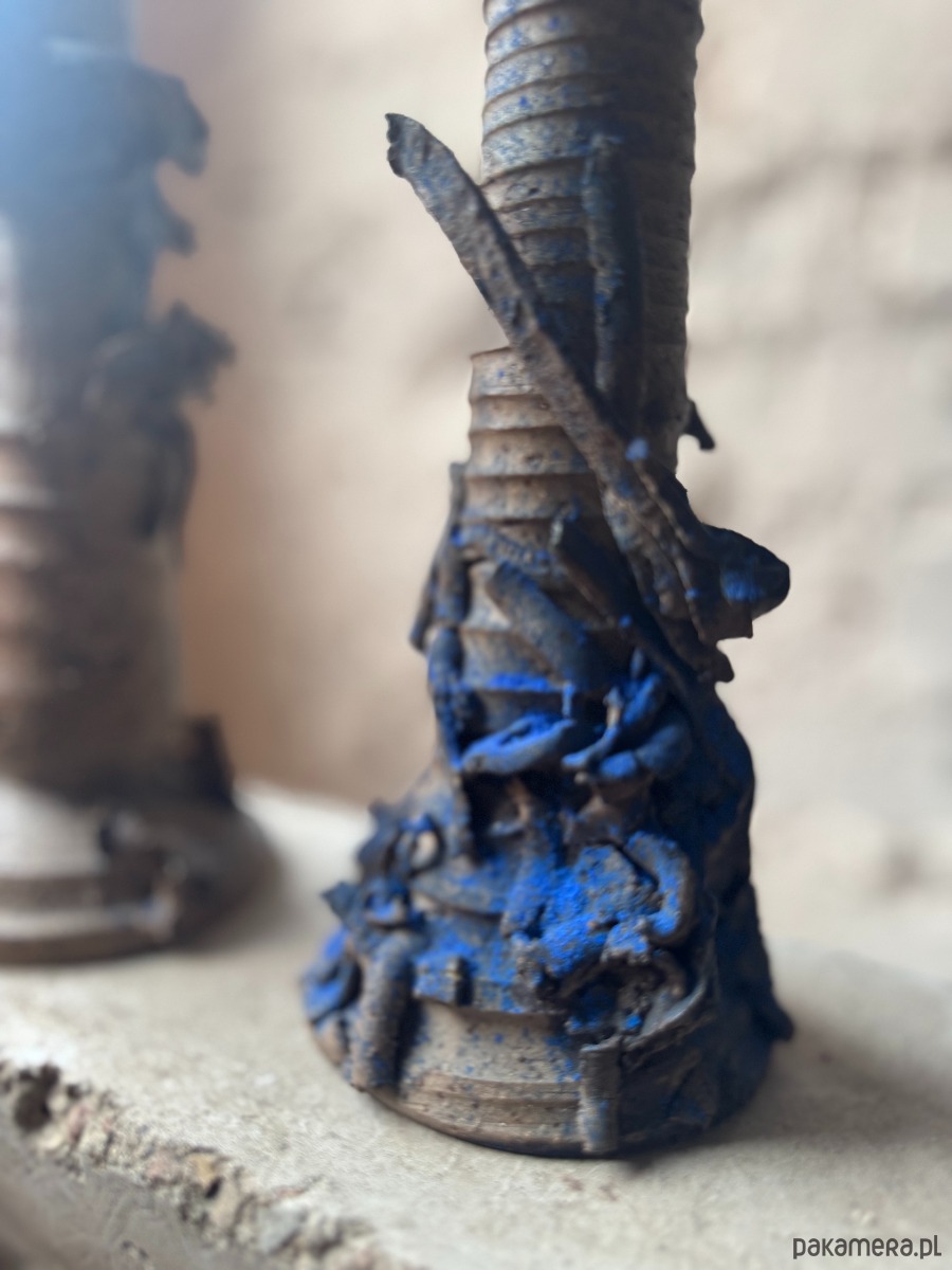 Struktura przypominająca rafę nadaje świecznikom organiczny, nieregularny charakter. Została subtelnie oprószona pudrem z granatowego pigmentu, który osiada w zagłębieniach formy, budując skojarzenia z głębią morza, solą i światłem filtrowanym przez wodę. Kolor nie dominuje – raczej delikatnie podkreśla fakturę, jak ślad po długim zanurzeniu.