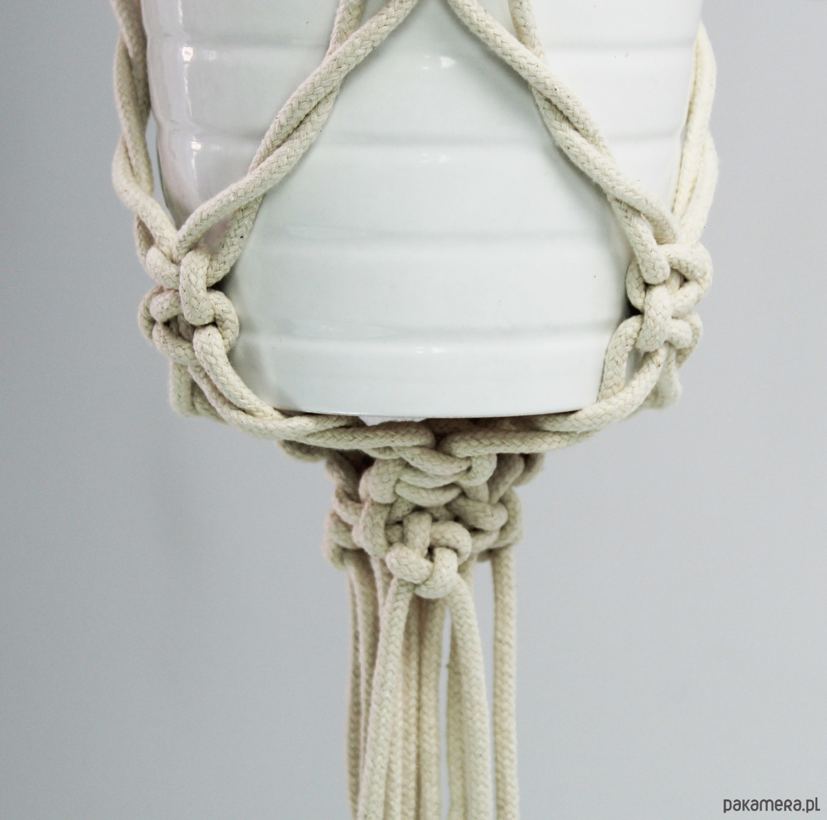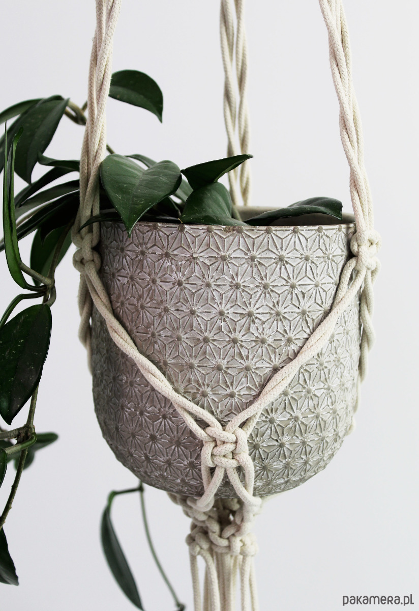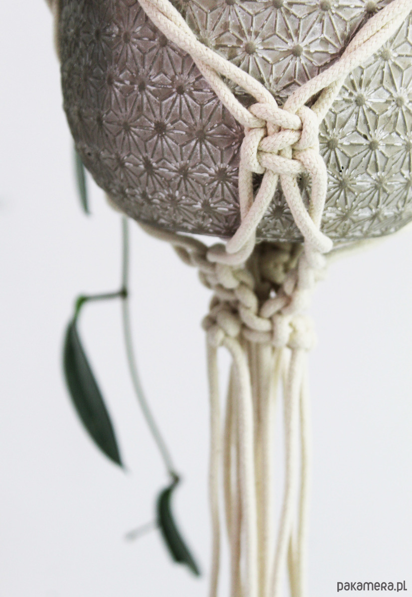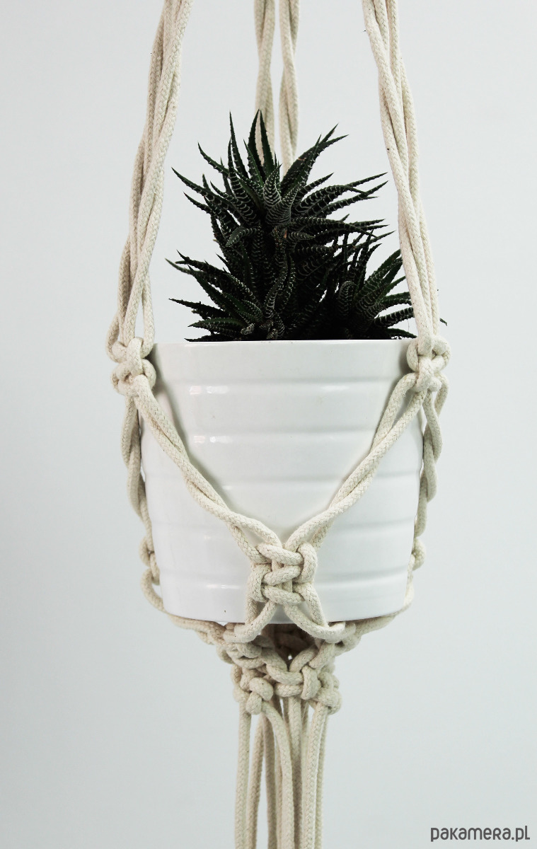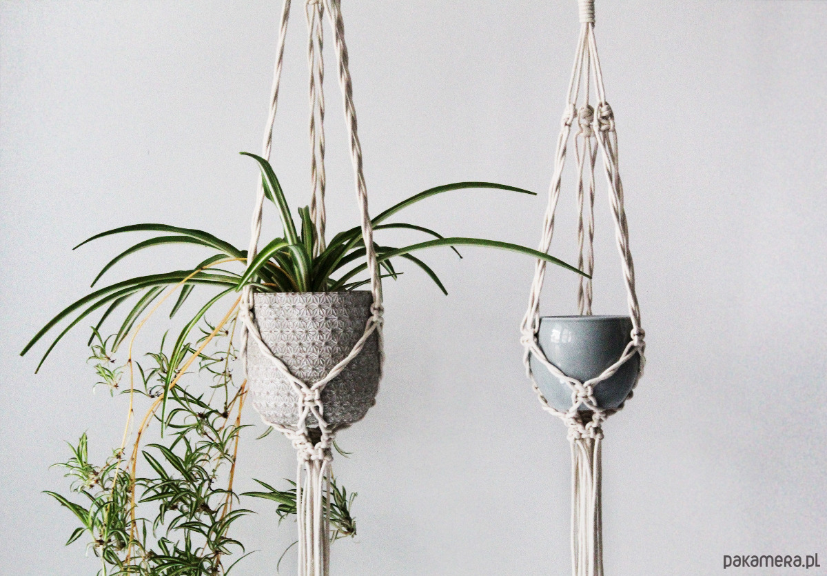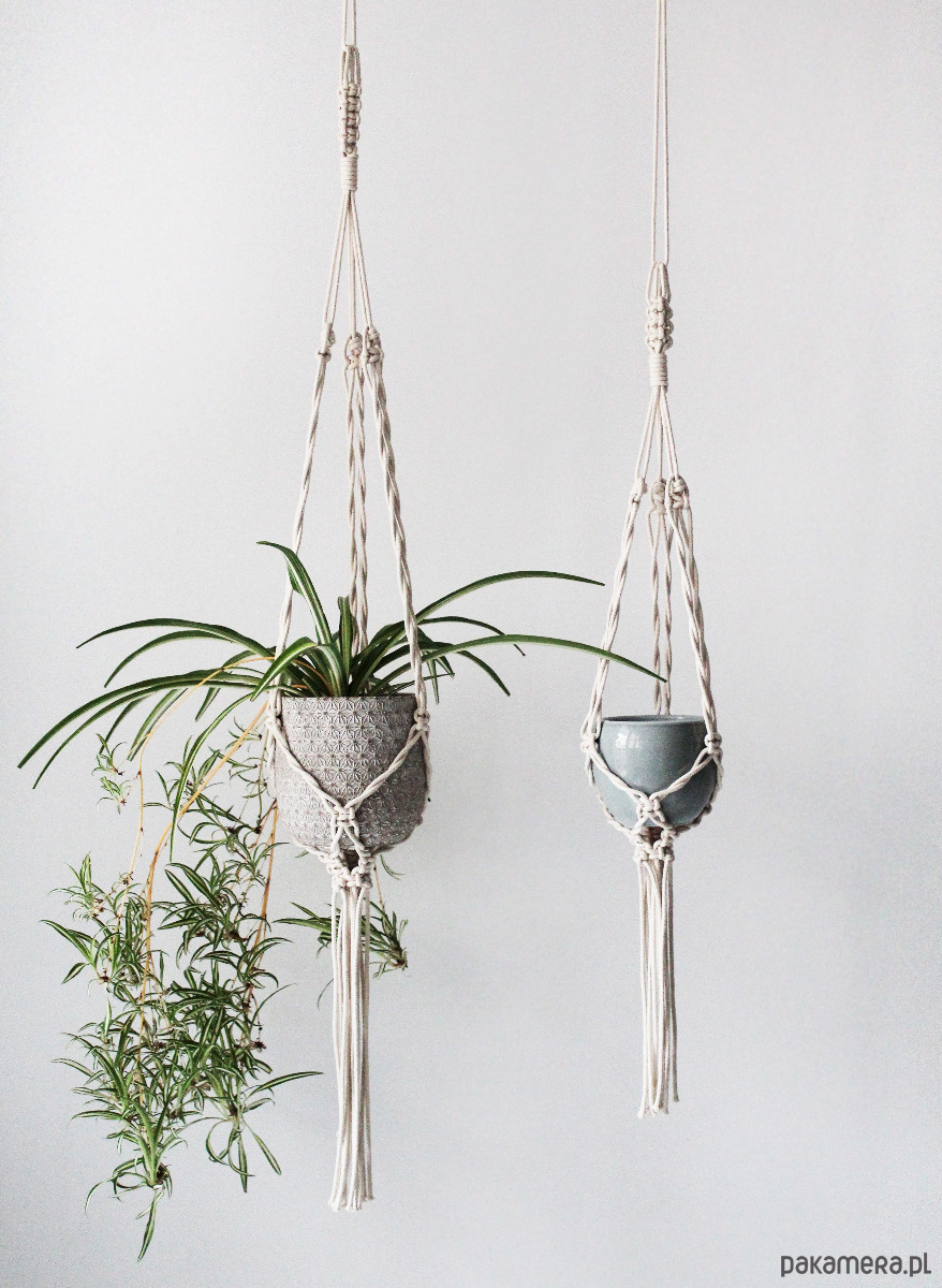 Zestaw dwóch kwietników wyplatanych ręcznie z naturalnego sznurka bawełnianego (techniką makramy). Wdzięczna ozdoba. Lekka, smukła konstrukcja.