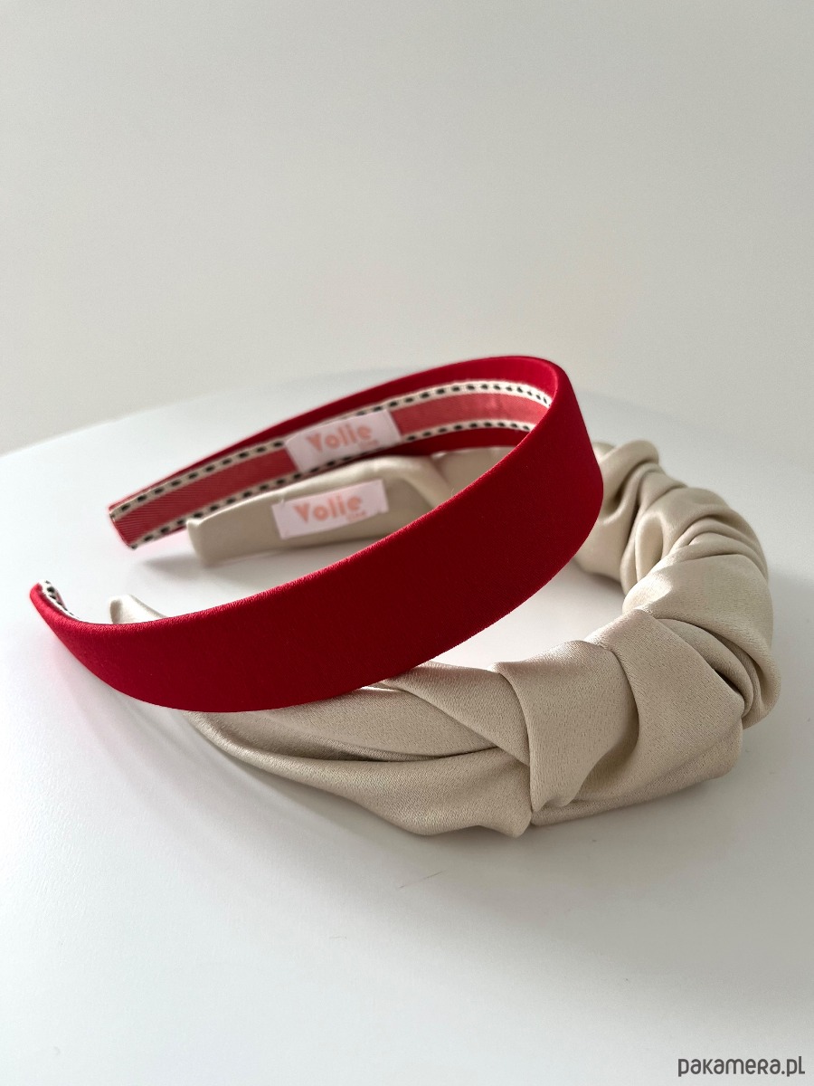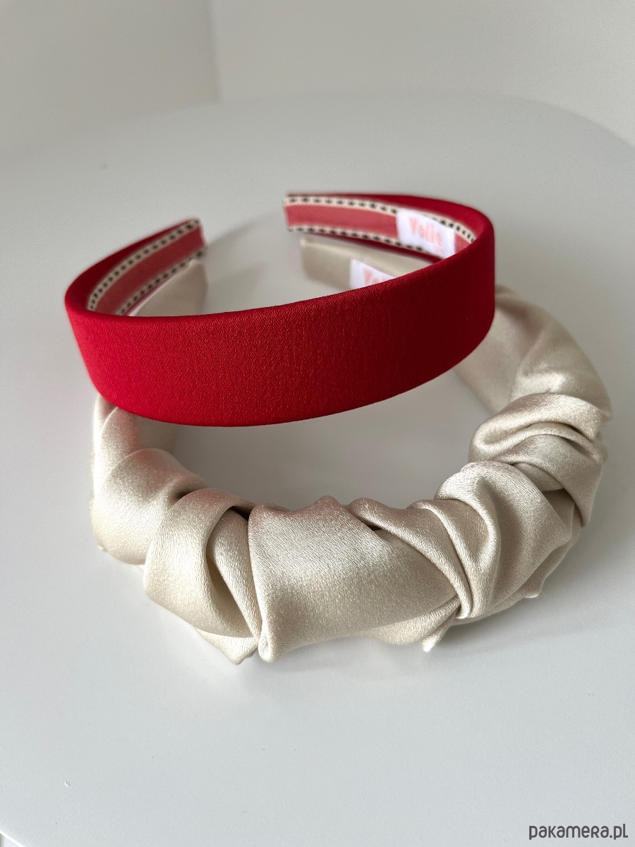 Zestaw dwóch opasek do włosów: Czerwona klasyczna płaska opaska Ally oraz opaska „Falowanka” Nicole w perłowym odcieniu.