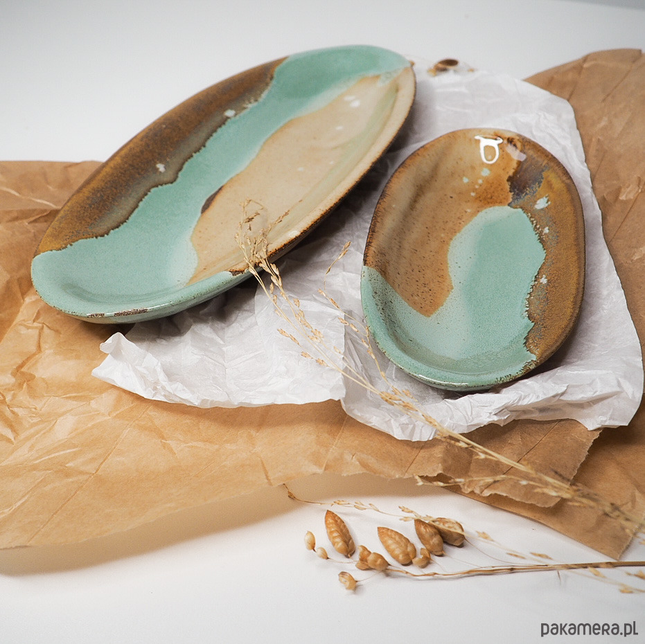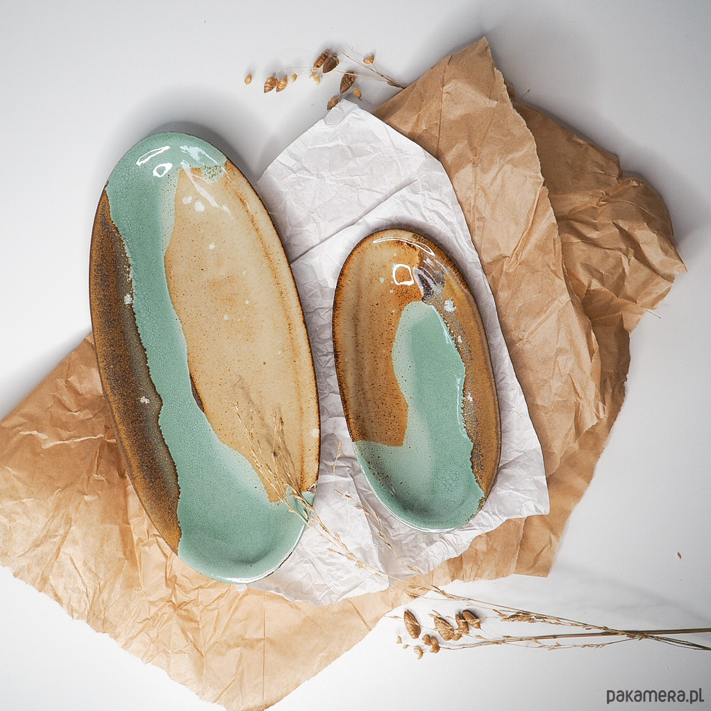 Zestaw dwóch owalnych pater w kolorach delikatnej miętowej zieleni, brązu i beżu.