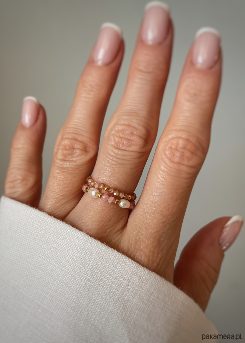 Zestaw dwóch pierścionków elastycznych z kamieni naturalnych – Rodochrozyt, Perła naturalna, Cyrkonia