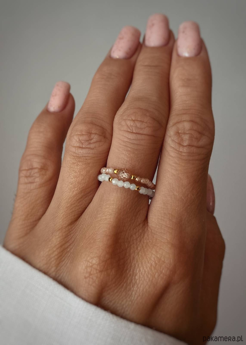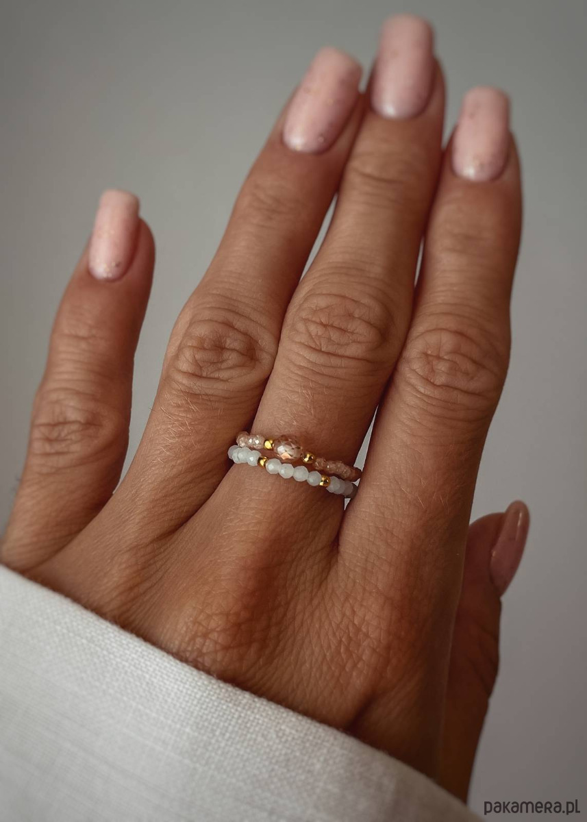 Zestaw dwóch pierścionków elastycznych z kamieni naturalnych – Amazonitu oraz Cyrkoni Szampańskiej.
