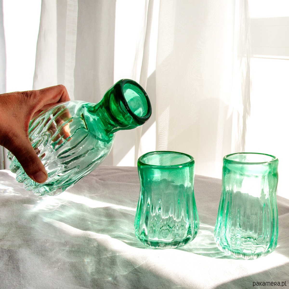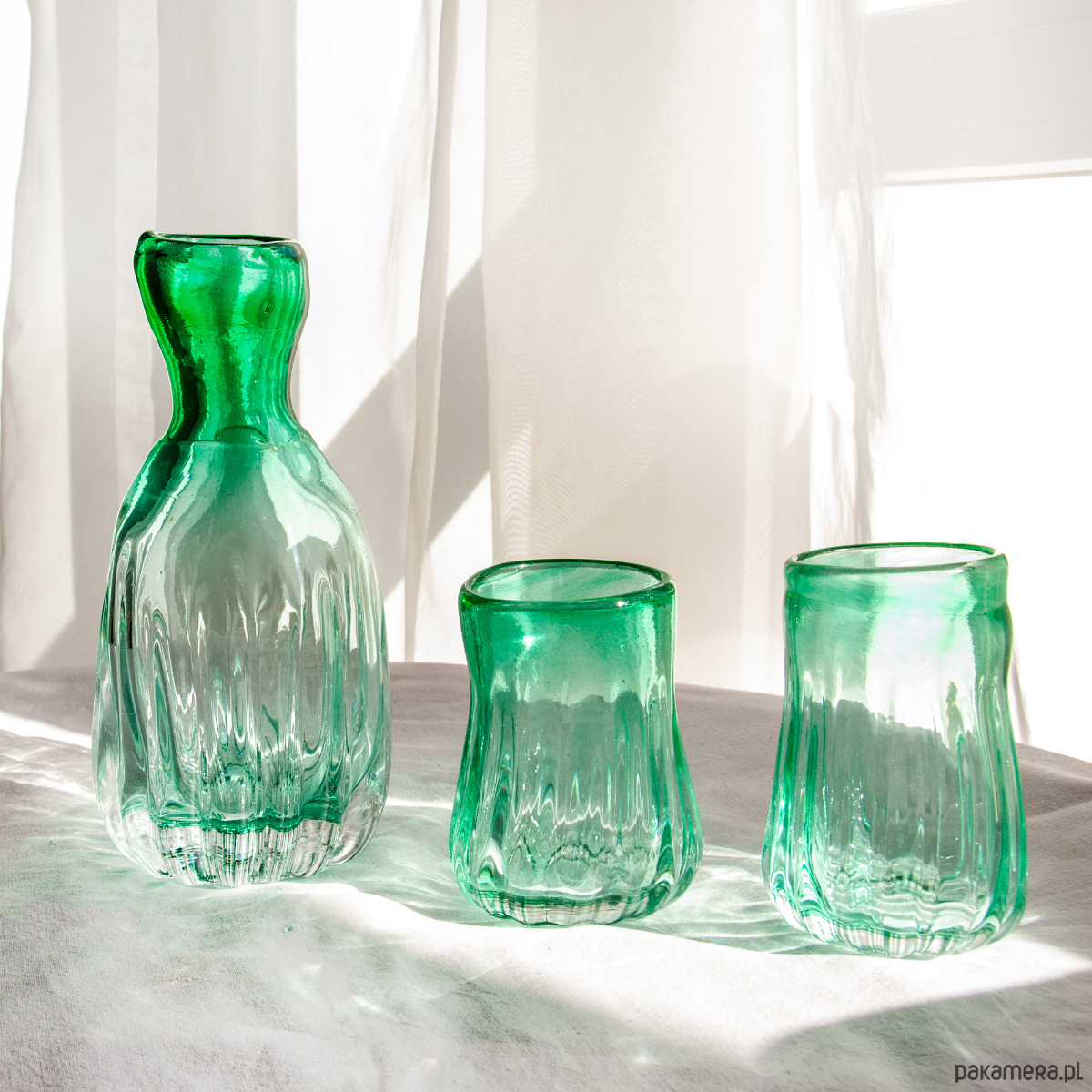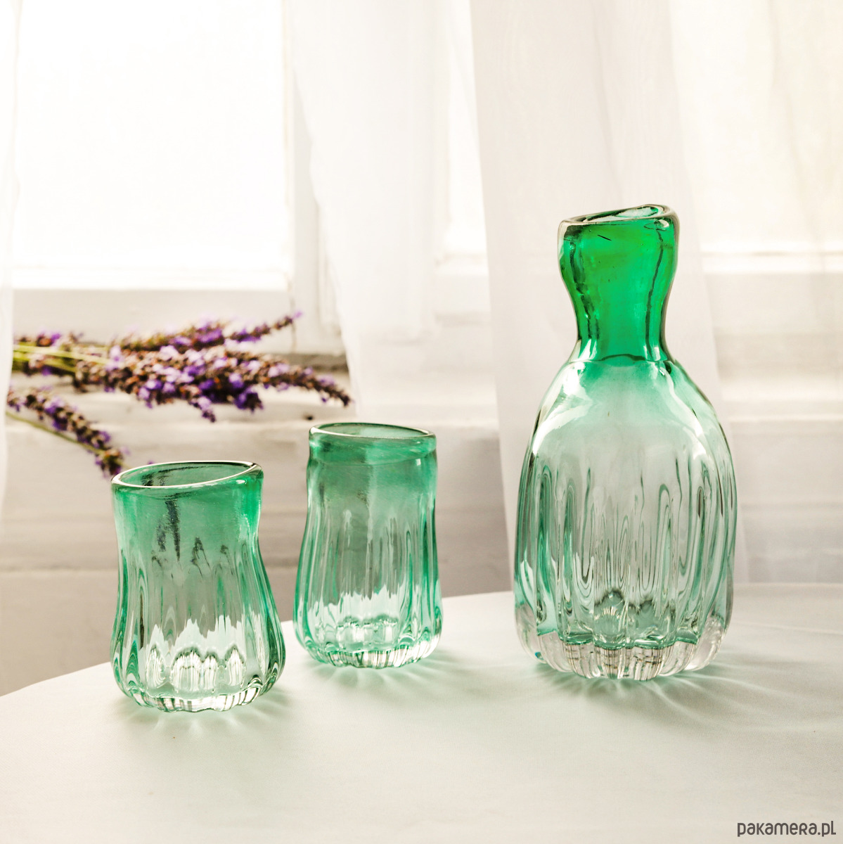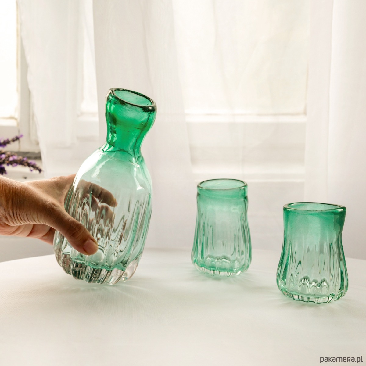Nieregularne, poręczne szklanki i karafka idealne leżą w dłoni.