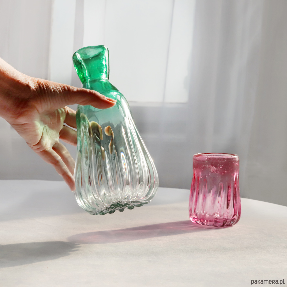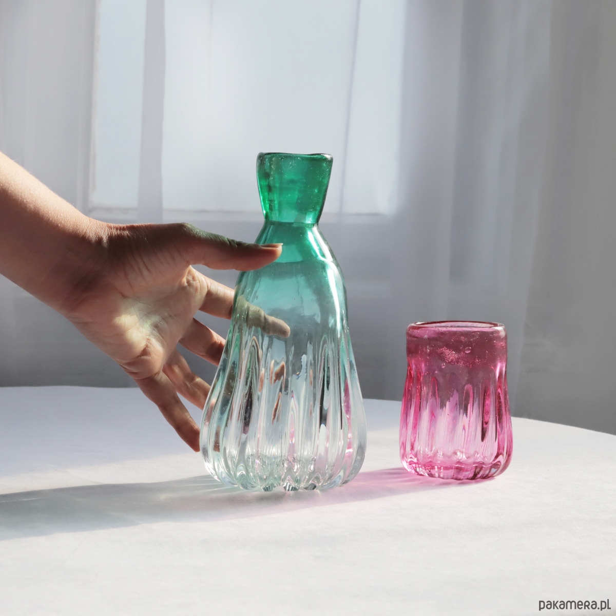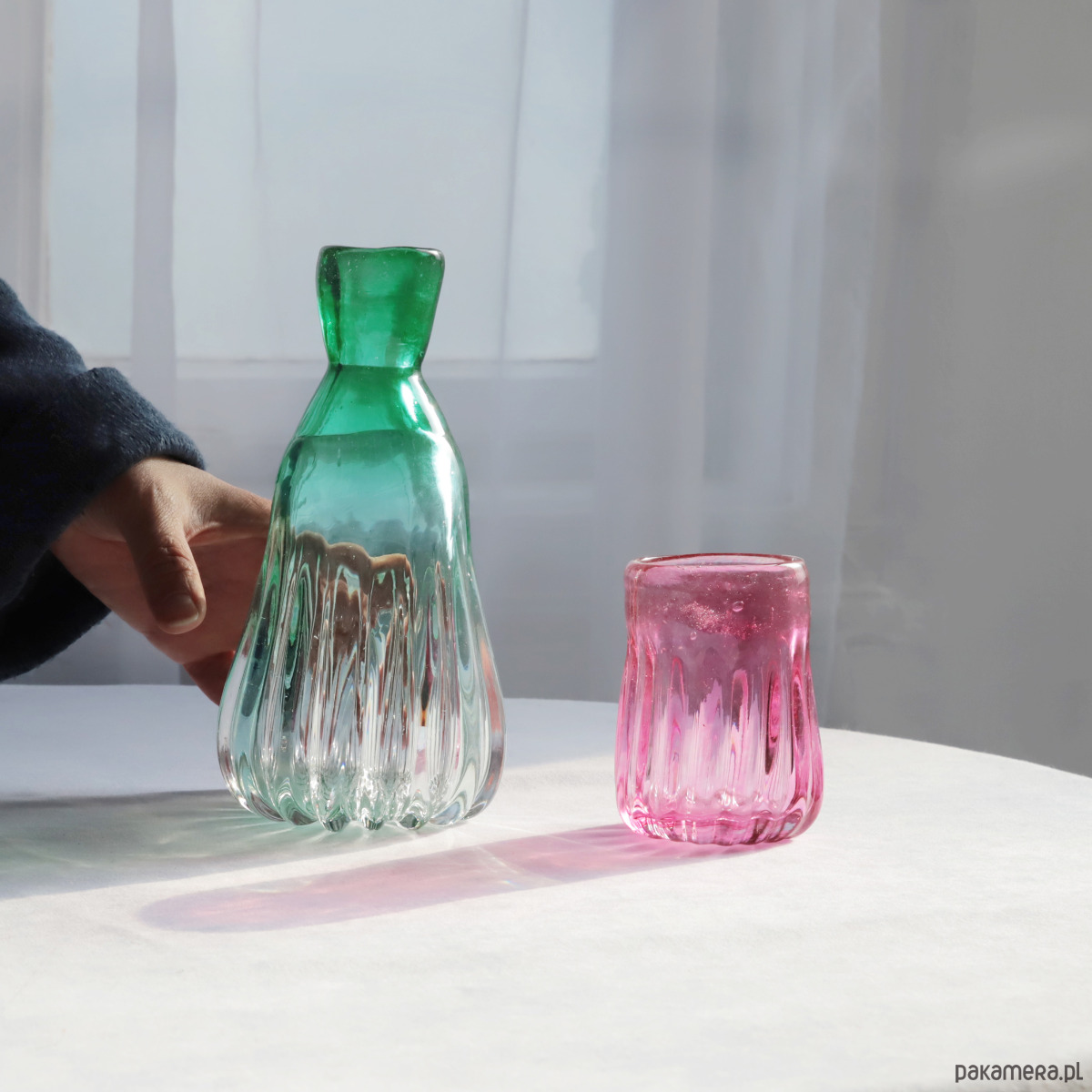 Zestaw dwóch szklanek i karafki „Optyk” powstał w wyniku wykorzystania metalowej przedformy dawniej używanej przez hutników do produkcji szkła w technice zwanej optyk. Wykorzystując pierwszy etap tej popularnej techniki uzyskałem fakturę szkła która w kolejnym etapie została podgrzana. W wyniku wysokiej temperatury szkło się zdeformowało i wygładziło. W tym procesie każda kolejna szklanka i karafka jest nieco inna od następnej. Do barwienia masy użyłem kolorowej fryty szklanej.