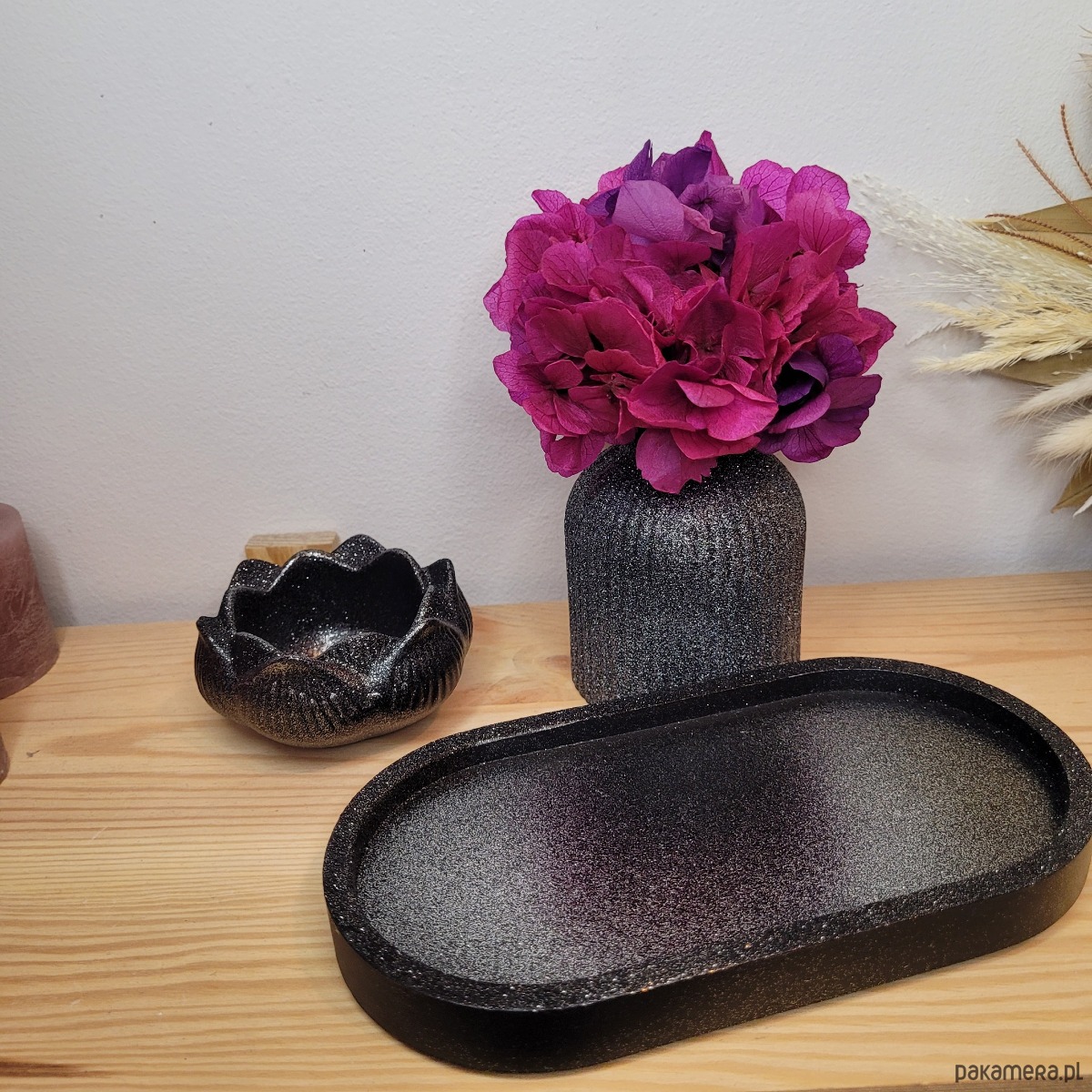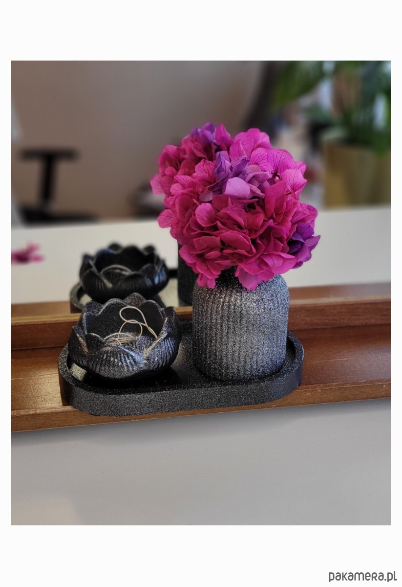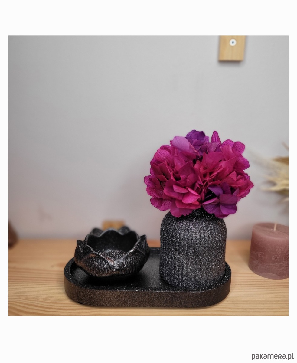 Elegancka taca – podstawa kompozycji, która harmonijnie łączy wszystkie elementy. Jej lśniąca powierzchnia dodaje tajemniczości i stylu.
