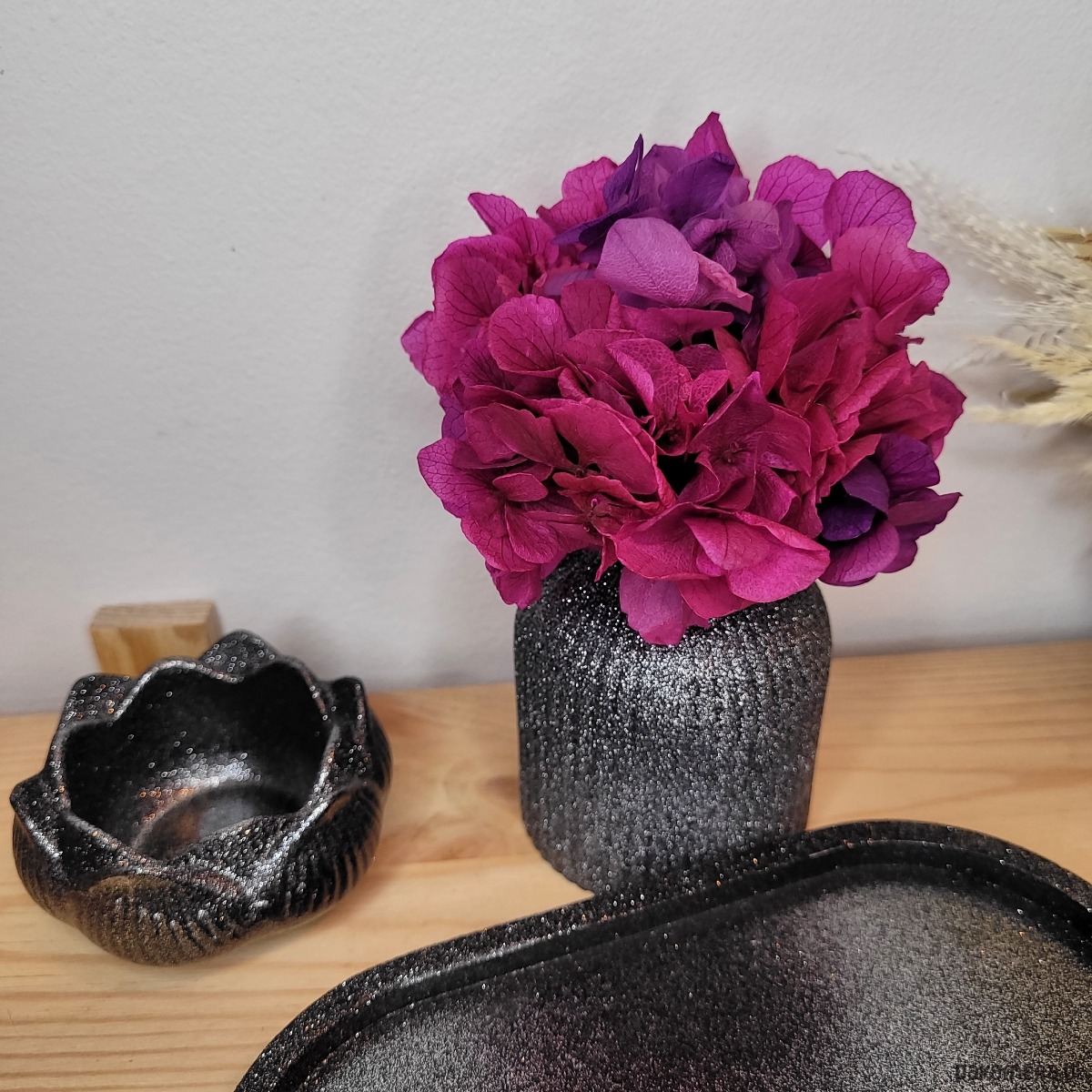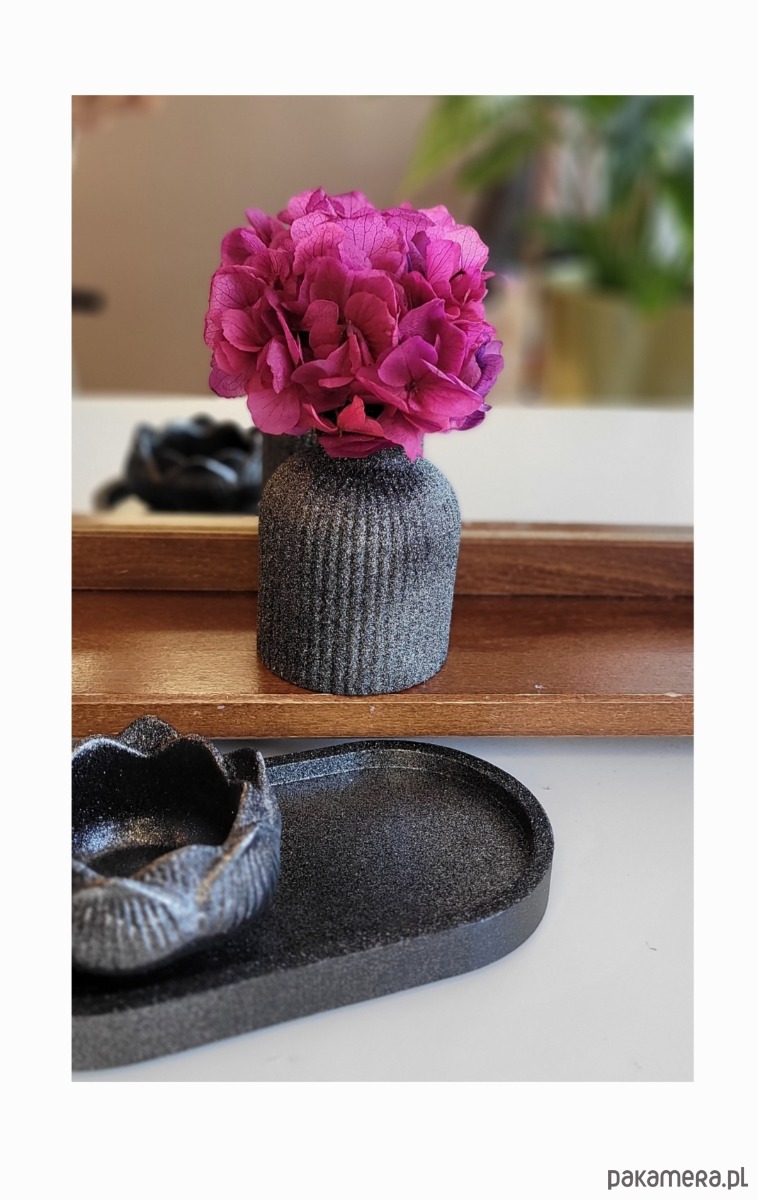 Stylowy wazon– ręcznie wykonany z gipsu i ozdobiony błyszczącym wykończeniem. Wewnątrz znajduje się stabilizowana hortensja, która nie wymaga pielęgnacji, a zawsze wygląda świeżo.