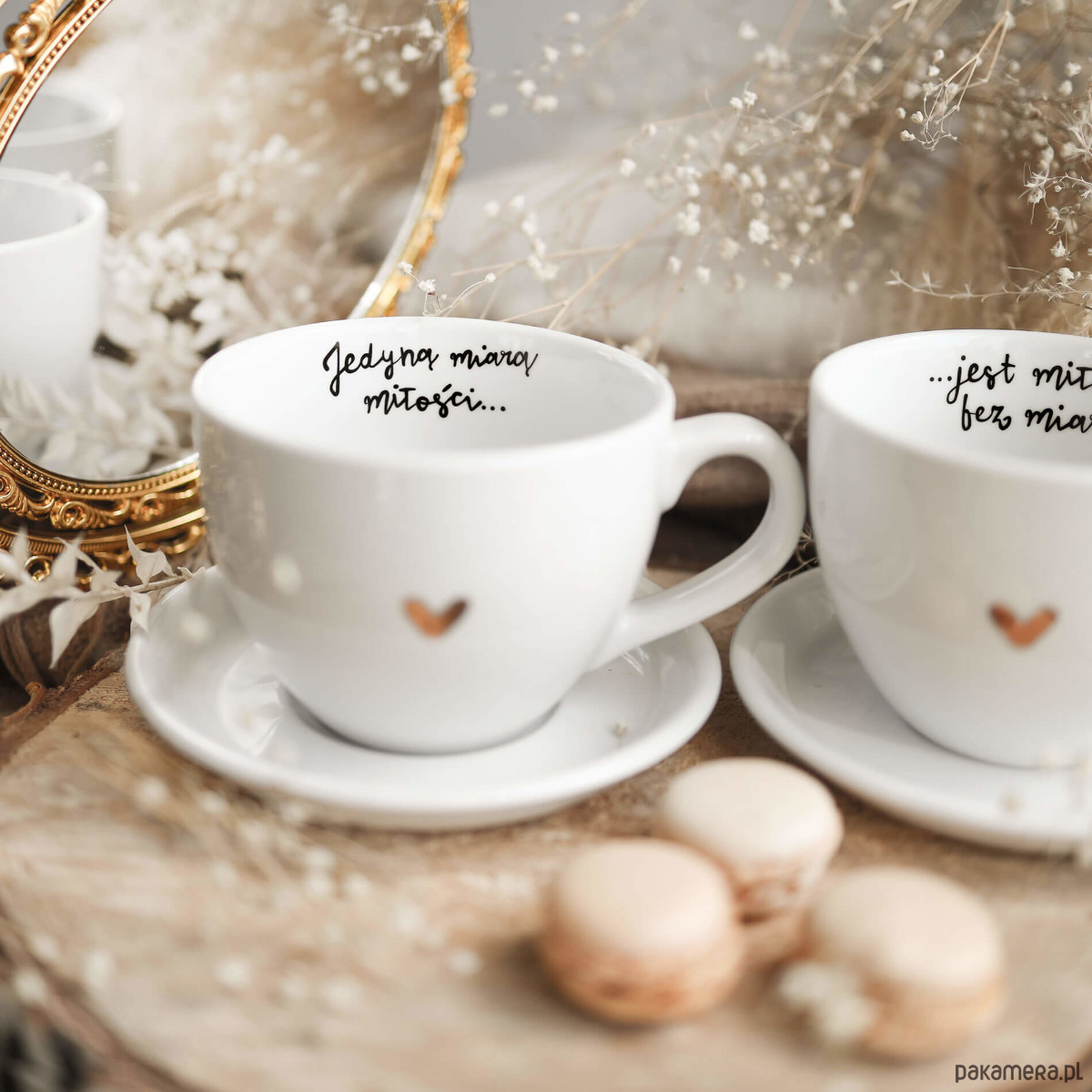 Zestaw filiżanek o pokaźnej pojemności na pewno sprawi, że wspólne śniadania, podwieczorki oraz kolacje nabiorą nowego wyrazu. Napis we wnętrzu filiżanek będzie widoczny podczas każdego łyku, dlatego dokładamy starań, by był on wykonany doskonale i nadzwyczajnie. Ozdobne pojedyncze serduszko na filiżankach w sposób nienachalny wskazuje tematykę oraz ogólną koncepcję naszych miłosnych zestawów.