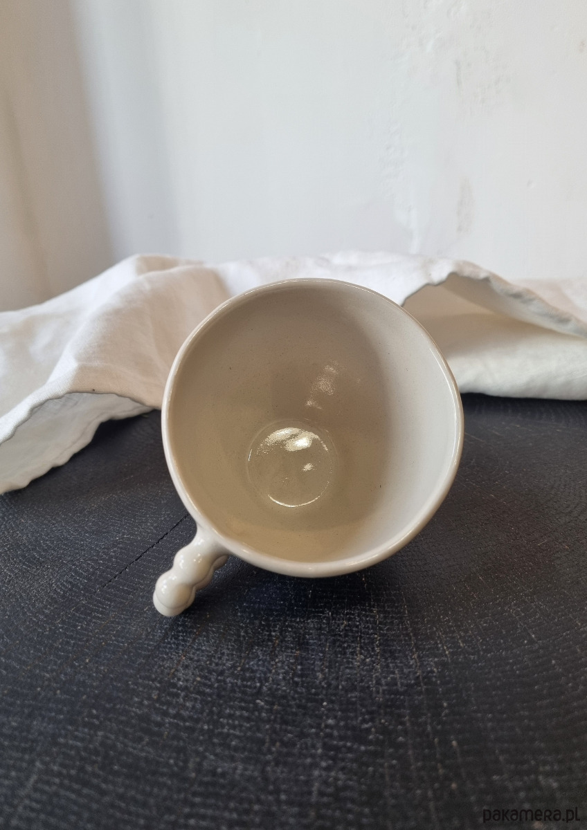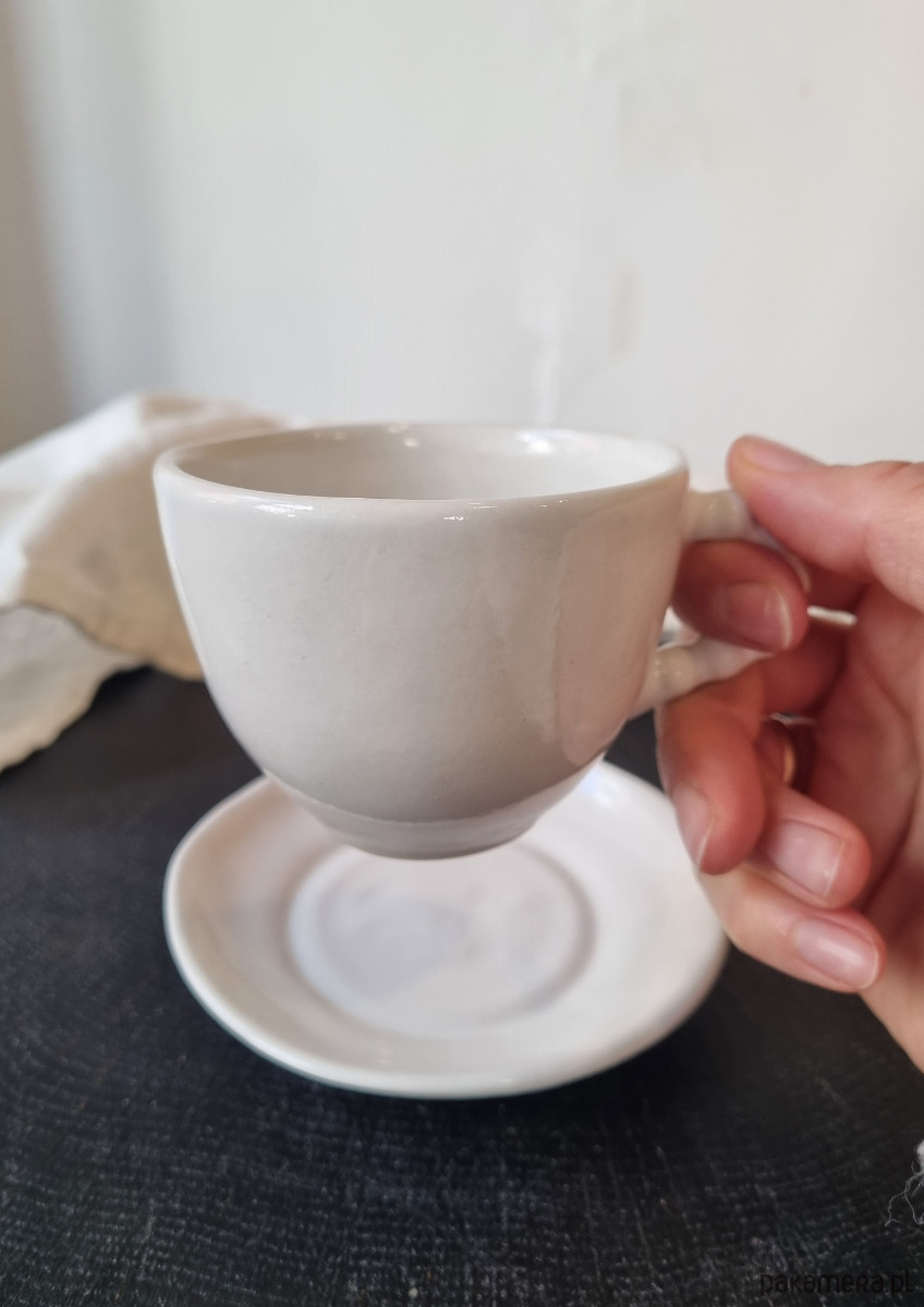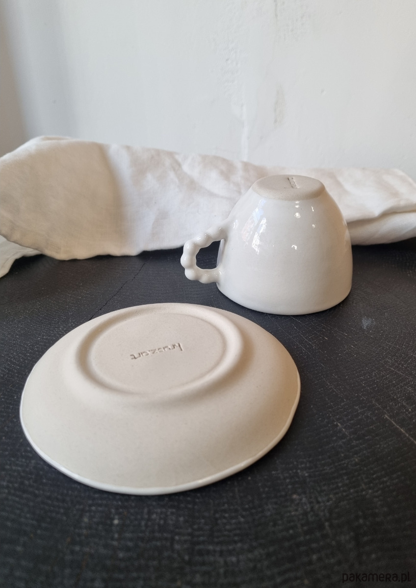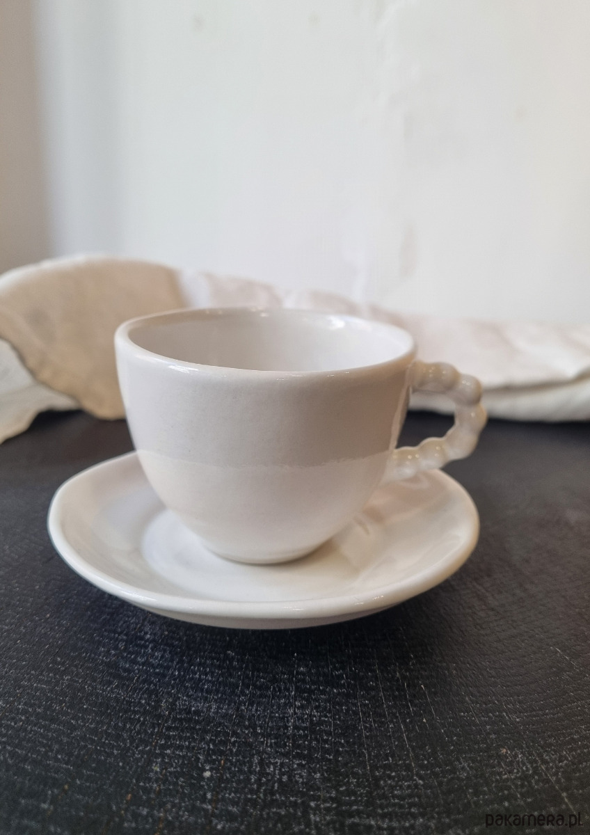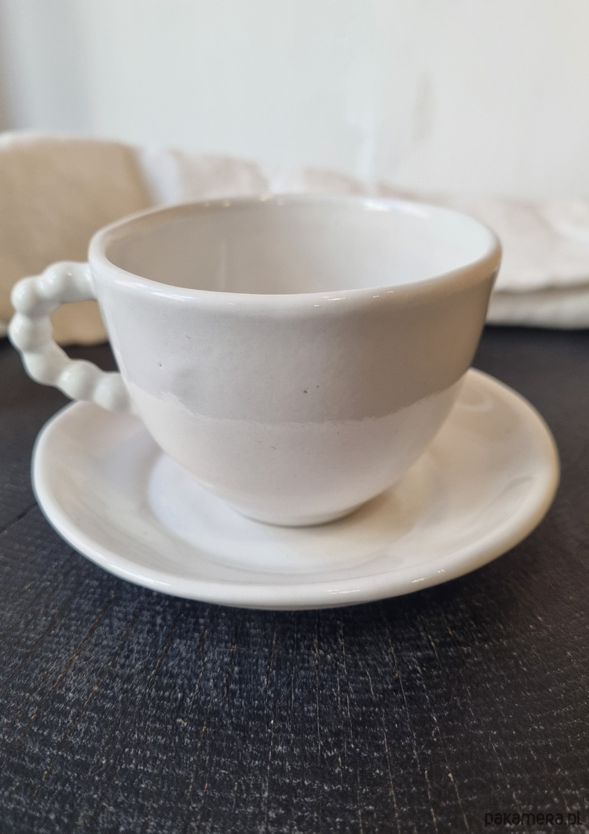 Przedstawiamy wyjątkową filiżankę ceramiczną z ozdobnym uchem i spodkiem w komplecie.