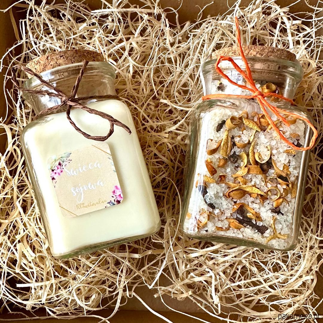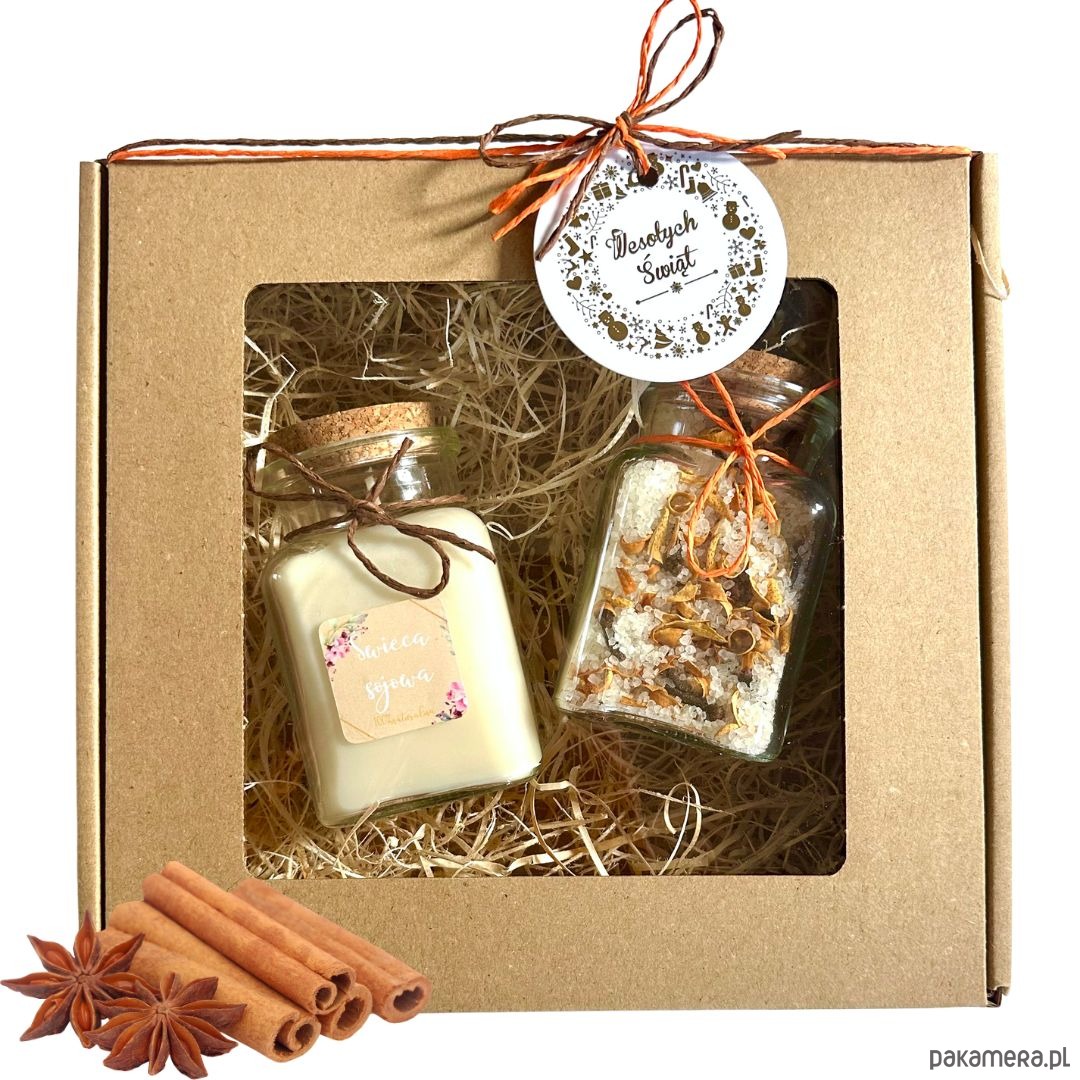 Zestaw idealny do domowego relaksu. Sól do kąpieli oraz sojowa świeca, idealny komplet do odprężającej kąpieli. Zestaw stworzony z myślą zarówno o kobietach, jak i mężczyznach. Zestaw Gorąca kąpiel *2 sprawdzi się również jako świąteczny prezent, ze względy na bożonarodzeniowe zapachy pomarańczy i cynamonu . Zestaw zapakowany w tekturowe pudełko z okienkiem, przewiązane kolorowym papierowym sznurkiem z białą przywieszka ze złotym napisem: Wesołych świąt.