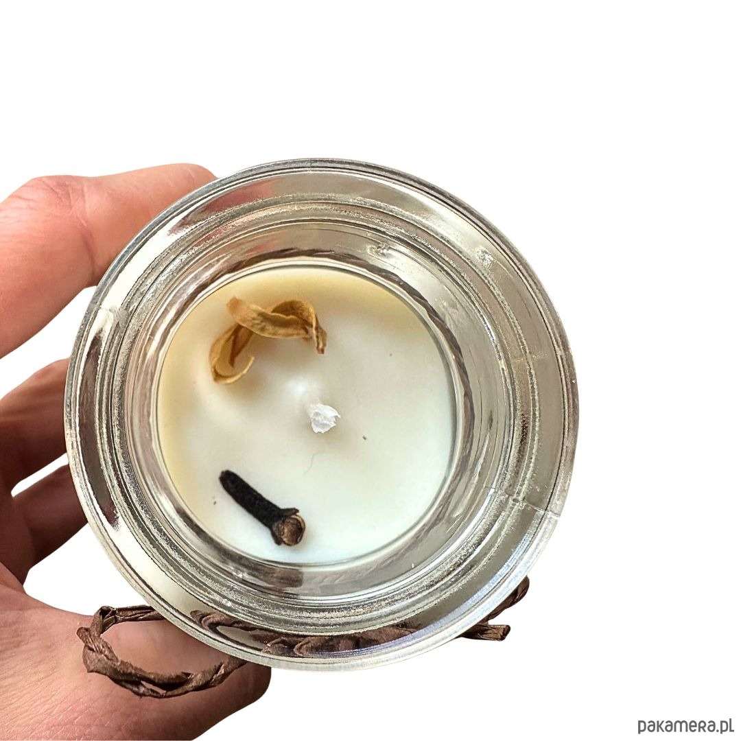 * Świeca sojowa Korzenna pomarańcza, 160ml, posiada słodki korzenny zapach przełamany nutą orzeźwiającej pomarańczy.