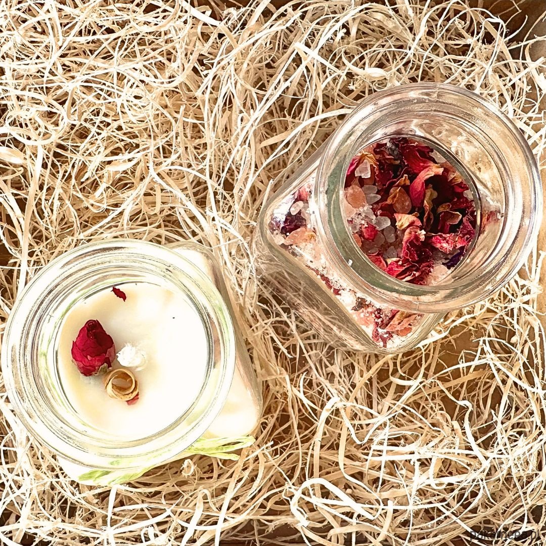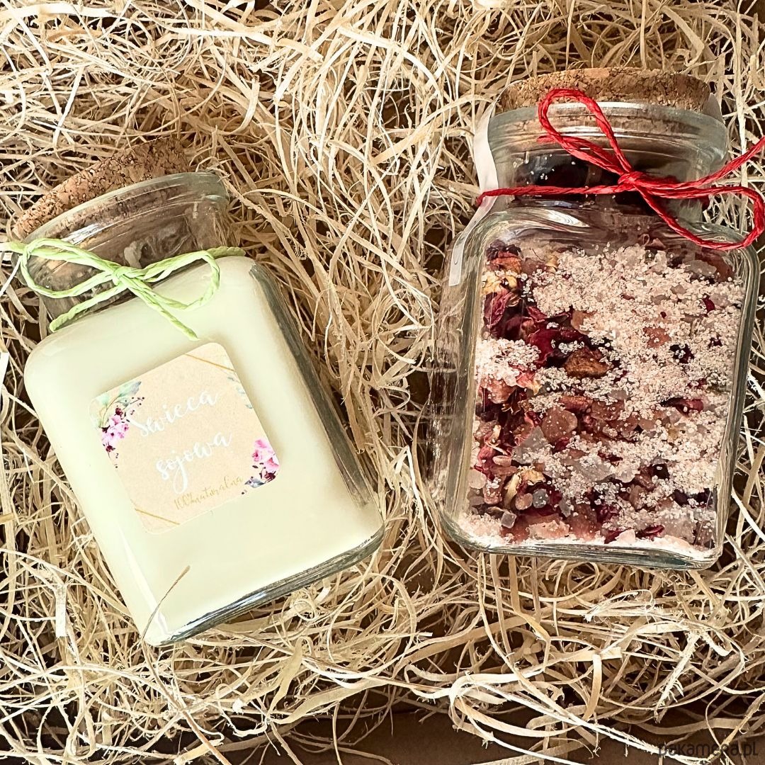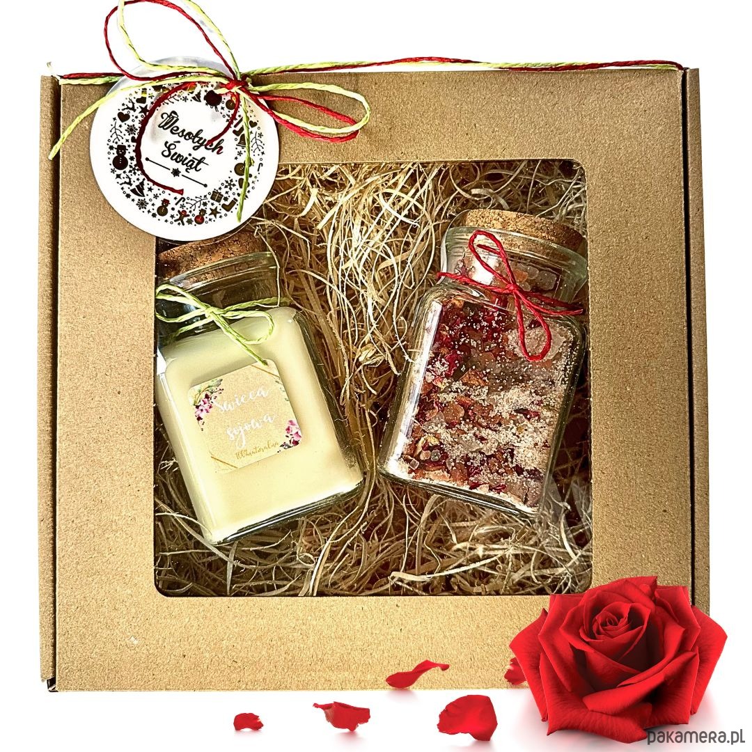 Zestaw idealny do domowego relaksu. Sól do kąpieli oraz sojowa świeca, idealny komplet do odprężającej kąpieli. Zestaw stworzony z myślą o kobietach. Sól kąpielowa pełna płatków róży o kwiatowym zapachu i świeca o zapachu bukietu kwiatów ozdobiona pąkiem róży. Zestaw zapakowany w tekturowe pudełko z okienkiem, przewiązane kolorowym papierowym sznurkiem z białą przywieszka ze złotym napisem: Wesołych świąt.