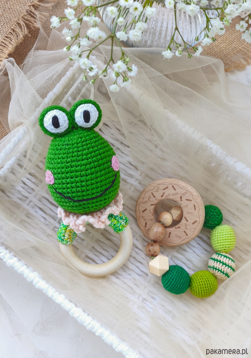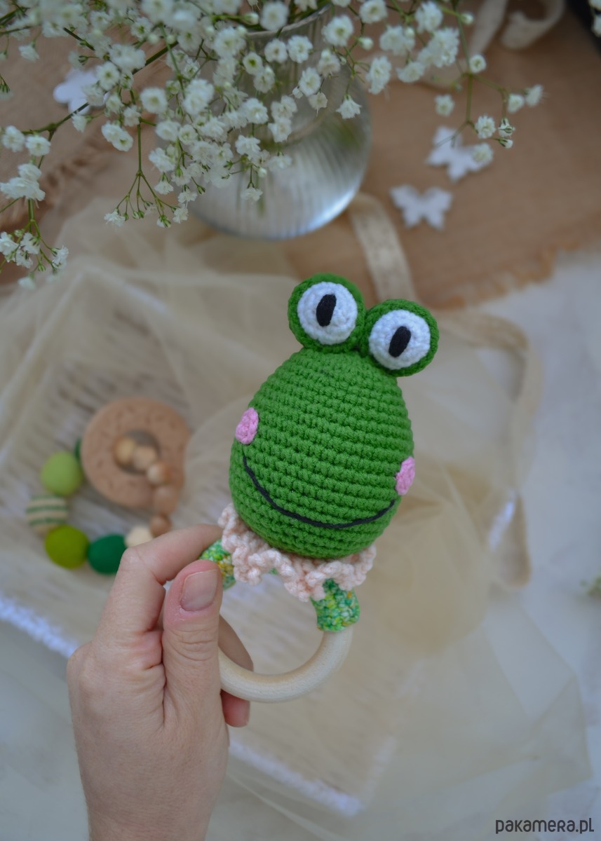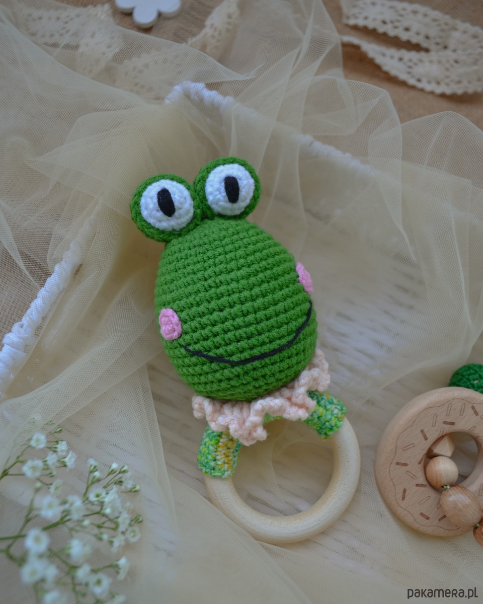 GRZECHOTKA żabka jest wyszydełkowana na drewnianym kółku bukowym z włóczki pół bawełnianej - miękkiej i przyjemnej w dotyku.