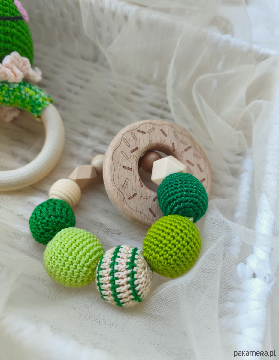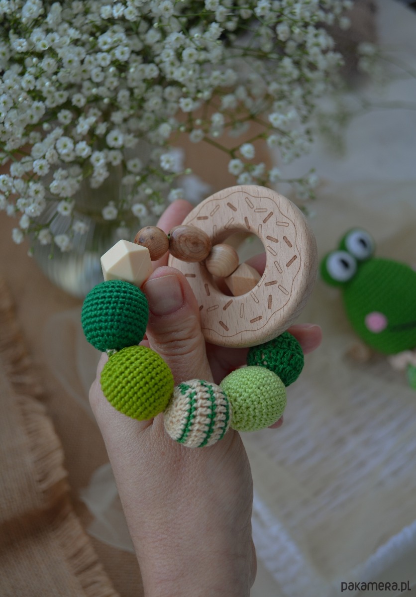 - Na bransoletce znajduje się także bukowy gryzaczek w kształcie pączka.
