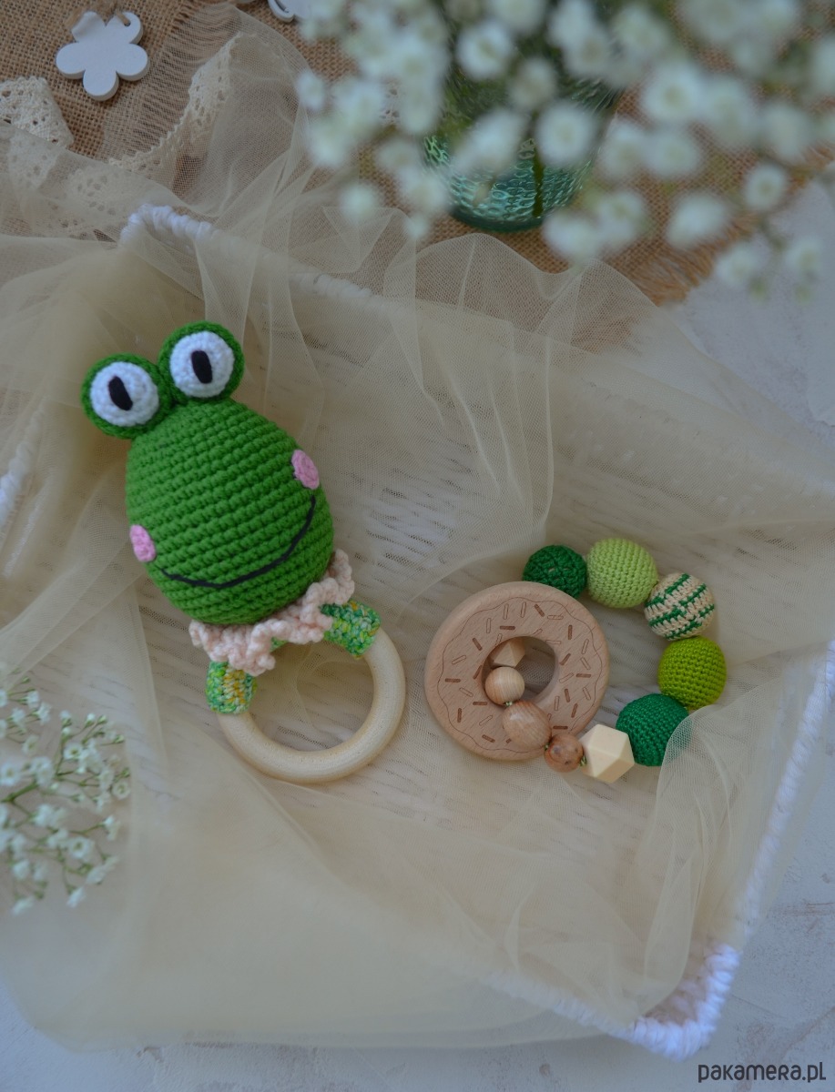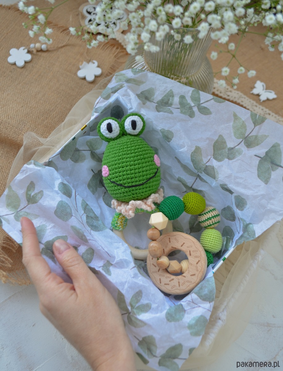 - grzechotki żabki na drewnianym kółku, gryzaka koralikowego (slingobranzoletka), pudełeczka prezentowego z wypełnieniem papierowym, dekorowane wstążką