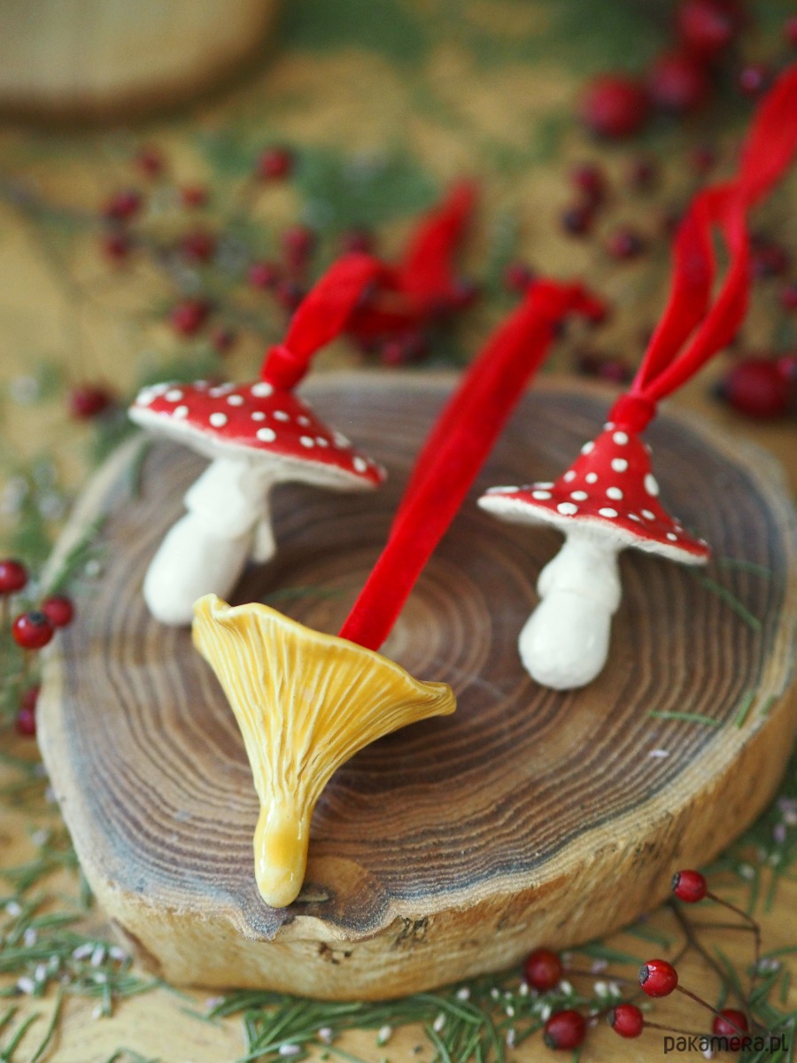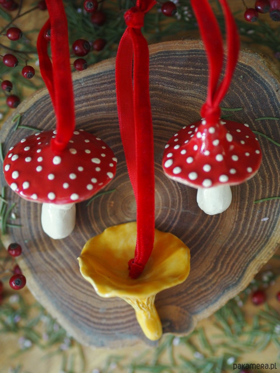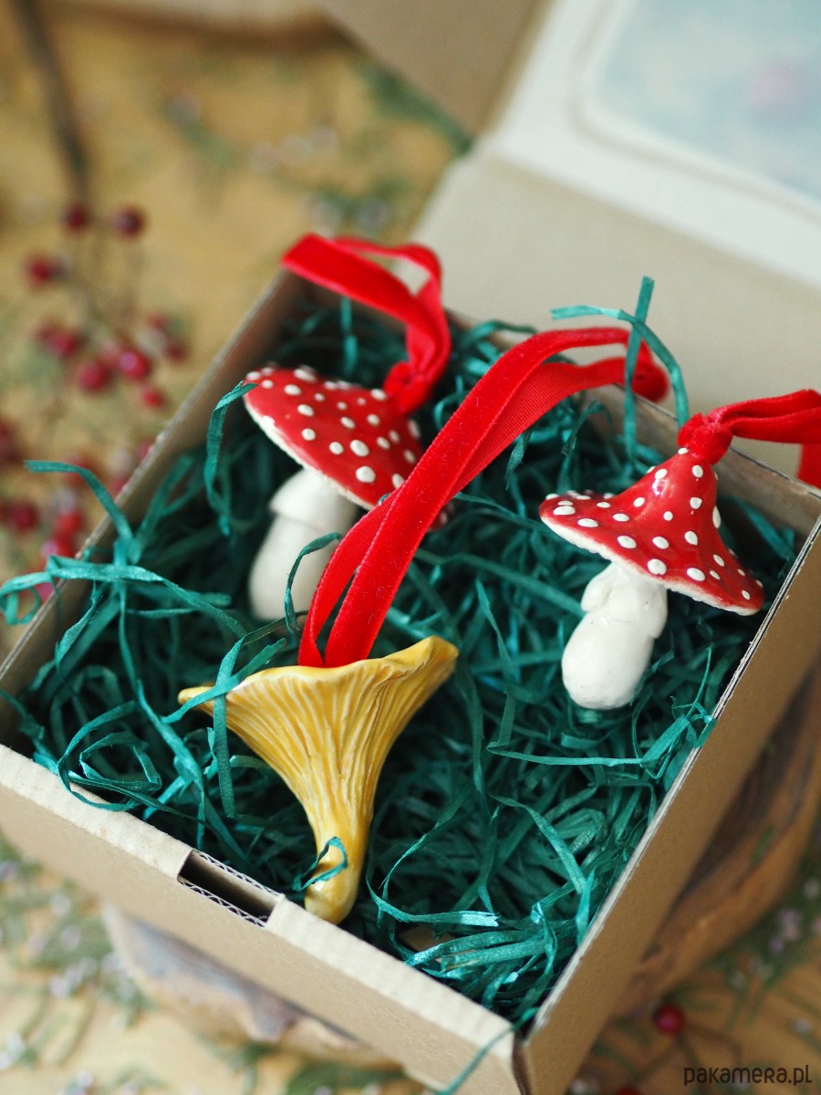 Zestaw trzech wyjątkowych, ręcznie formowanych grzybków na choinkę w pudełku 10x10cm. Każda sztuka to unikat- nie ma 2 identycznych. Taki upominek ucieszy każdego grzybiarza. Aksamitna wstążka pięknie kontrastuje z połyskującymi szkliwami.
