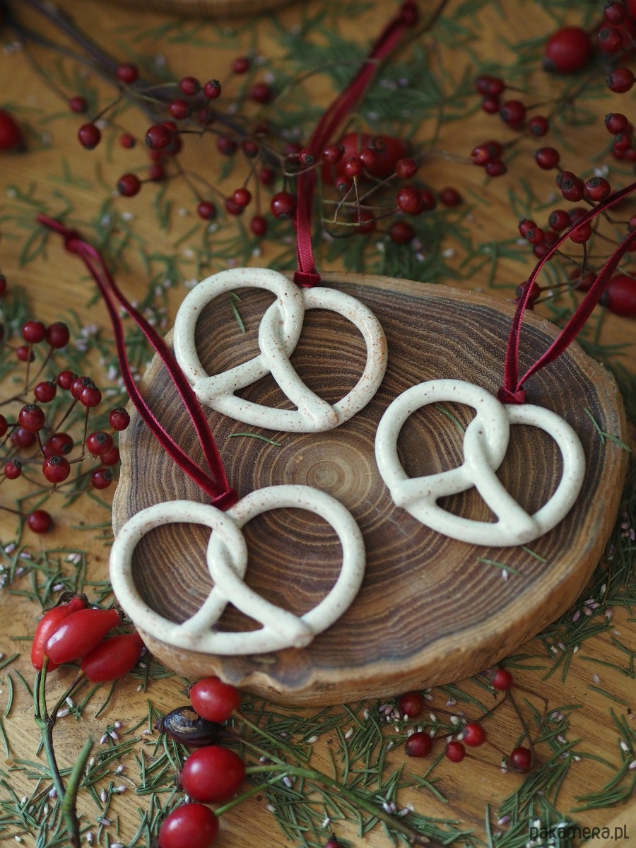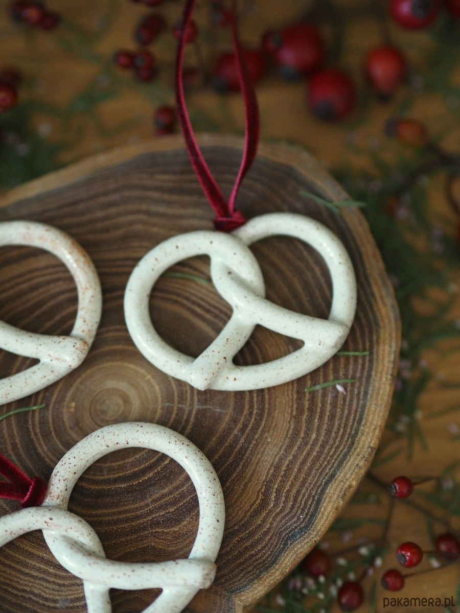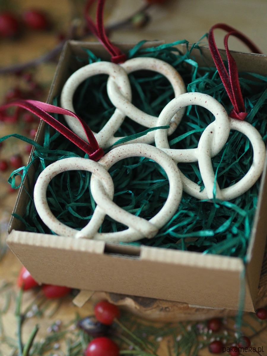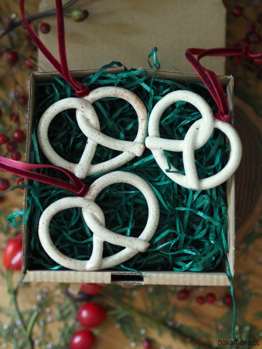 Zestaw trzech ceramicznych precli na choinkę w pudełku 10x10cm. Dwustronnie szkliwione, pięknie kontrastuje z aksamitną wstążką.