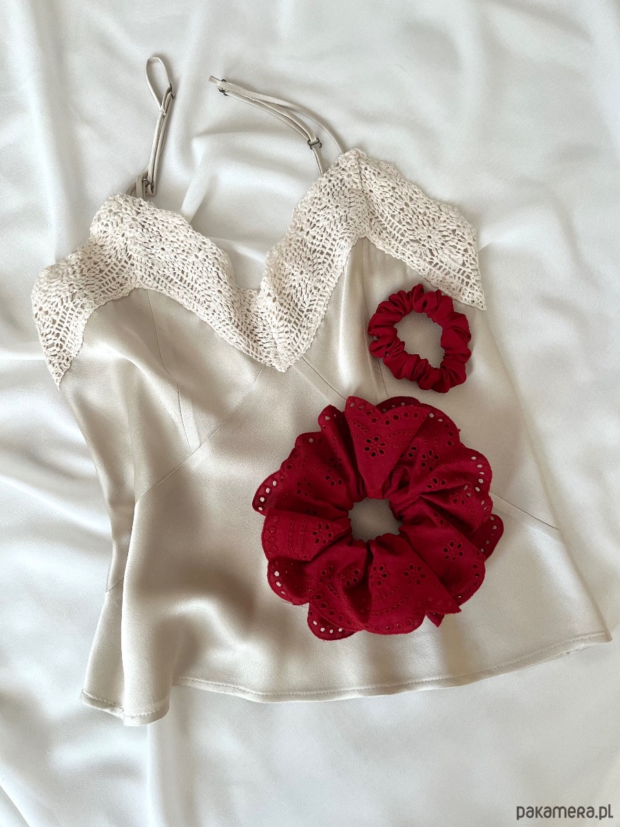 Głęboka czerwień, miękka bawełna i wyjątkowe wykończenie sprawiają, że ta scrunchie przyciąga spojrzenia i dodaje każdej stylizacji odrobiny magii.