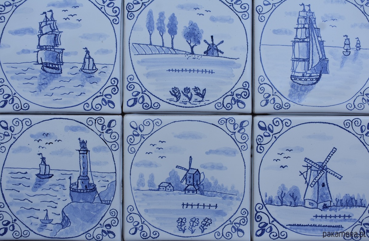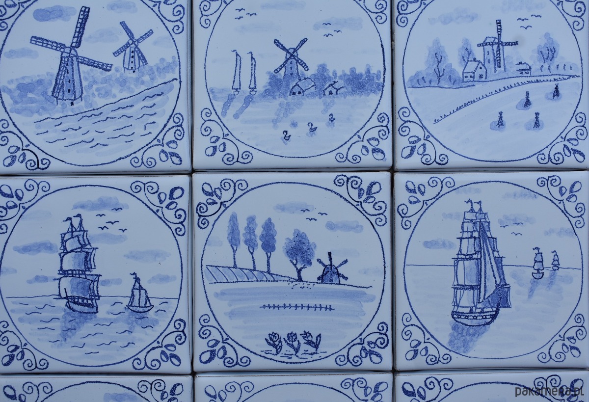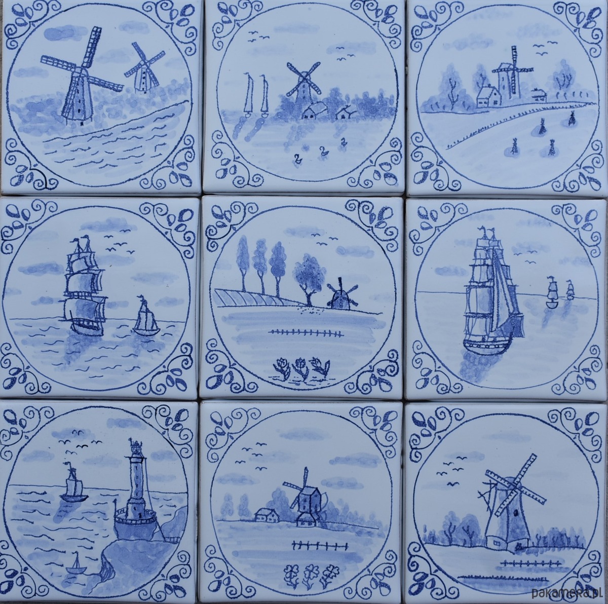 Zestaw 9 kafli ręcznie malowanych- wiatraki/ marynistyczne, wymiary 1 kafla 15x 15 cm, ręcznie malowane tlenek kobaltu na białym szkliwie. wypalone w temperaturze ponad 1000 stopni Celsjusza. Produkt współczesny. Cena za 9 szt.