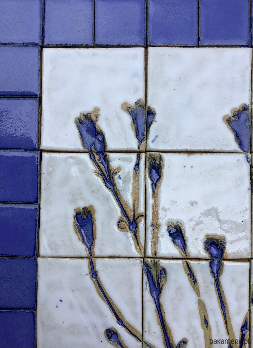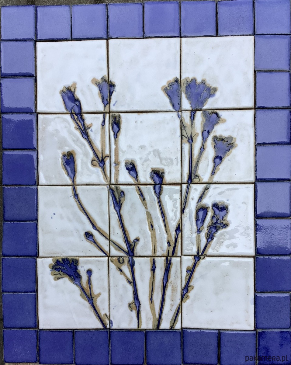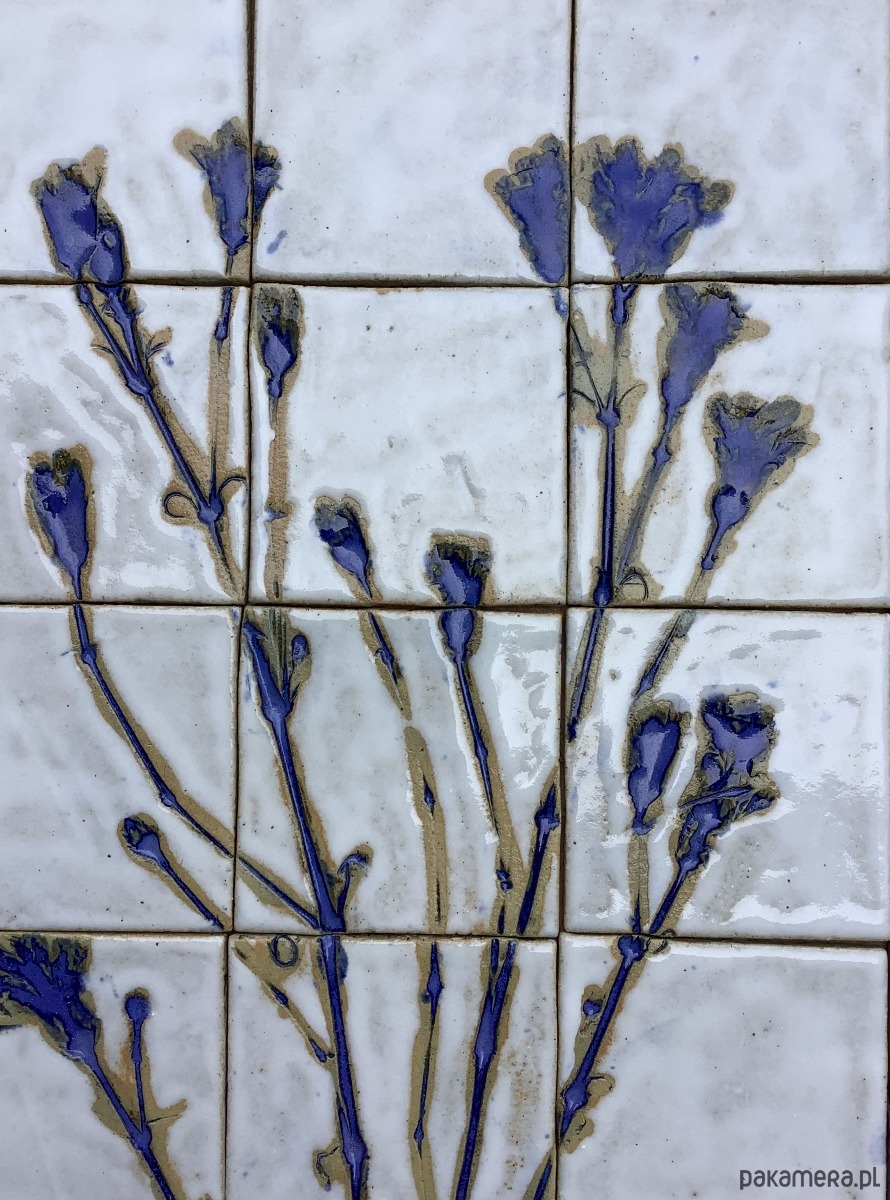 Kafle wykonane ręcznie z jasnej gliny szamotowej. Zestaw składa się z 12 płytek większych ozdobionych roślinami poszkliwionymi w kolorze niebieskim, a tło w kolorze białym. Całość obramowana ramką z kafelków w niebieskim kolorze. Zestaw w rozmiarze 40 x 50 cm. Grubość około 6 mm.