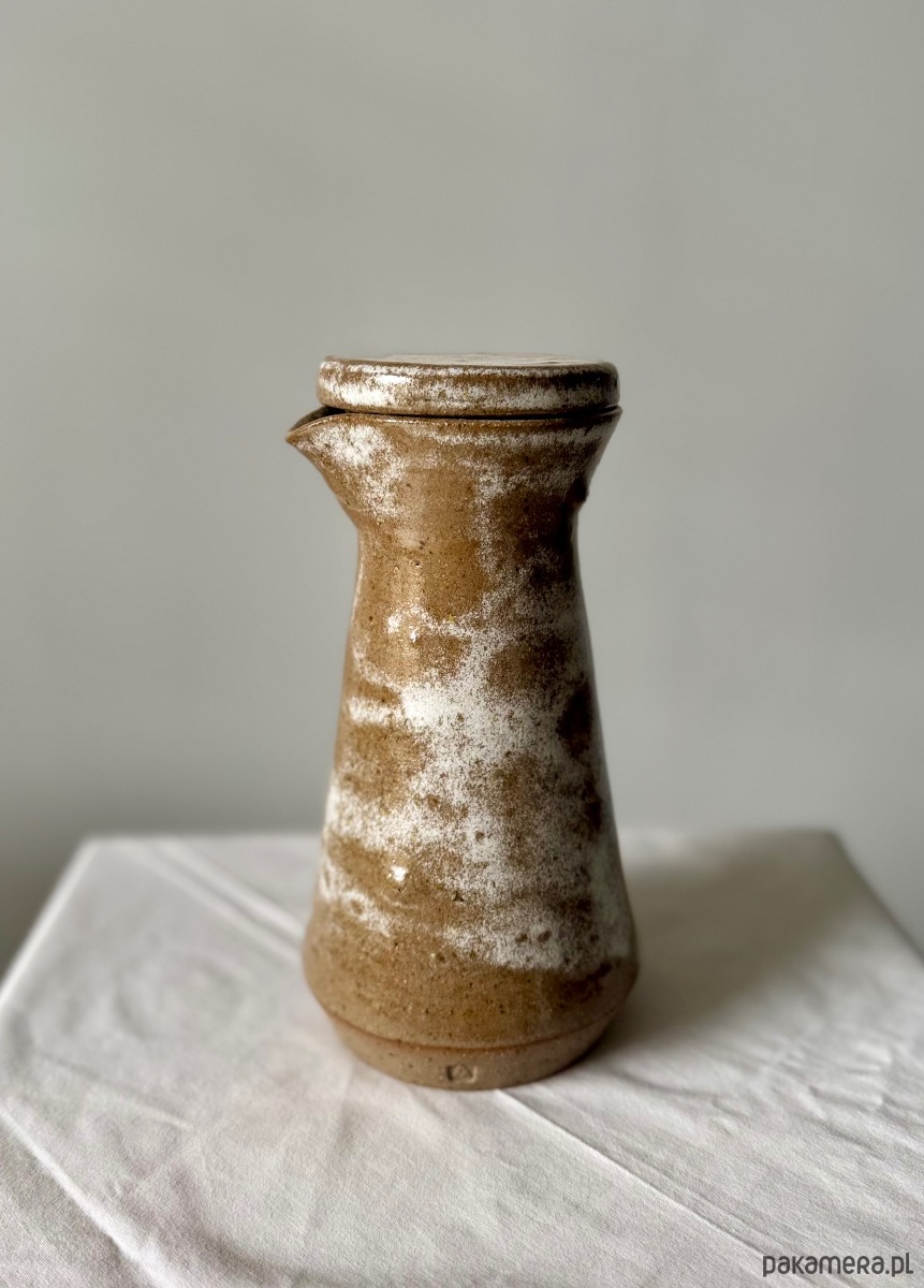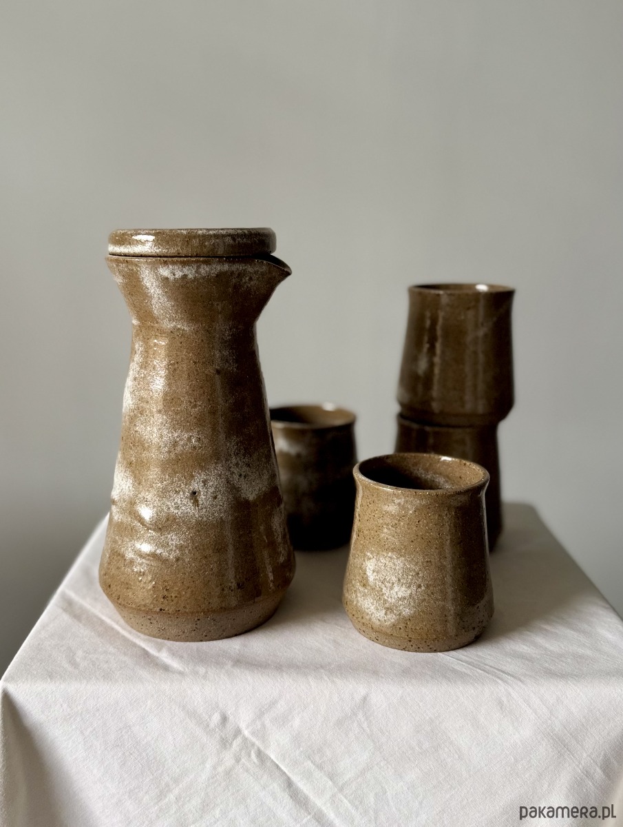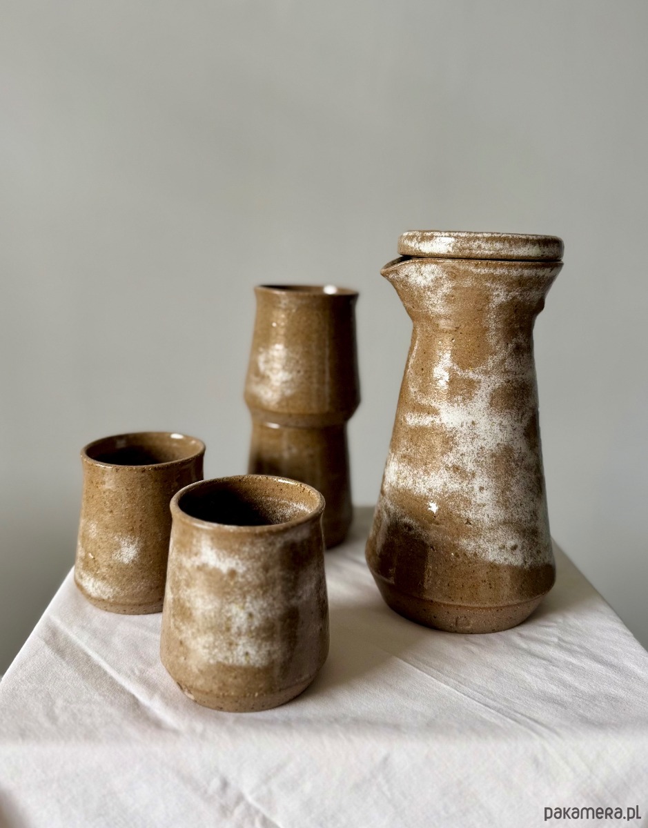Kamionkowy zestaw naczyń do napojów Storm. W skład zestawu wchodzi pojemna karafka z przykrywką i cztery czarki.