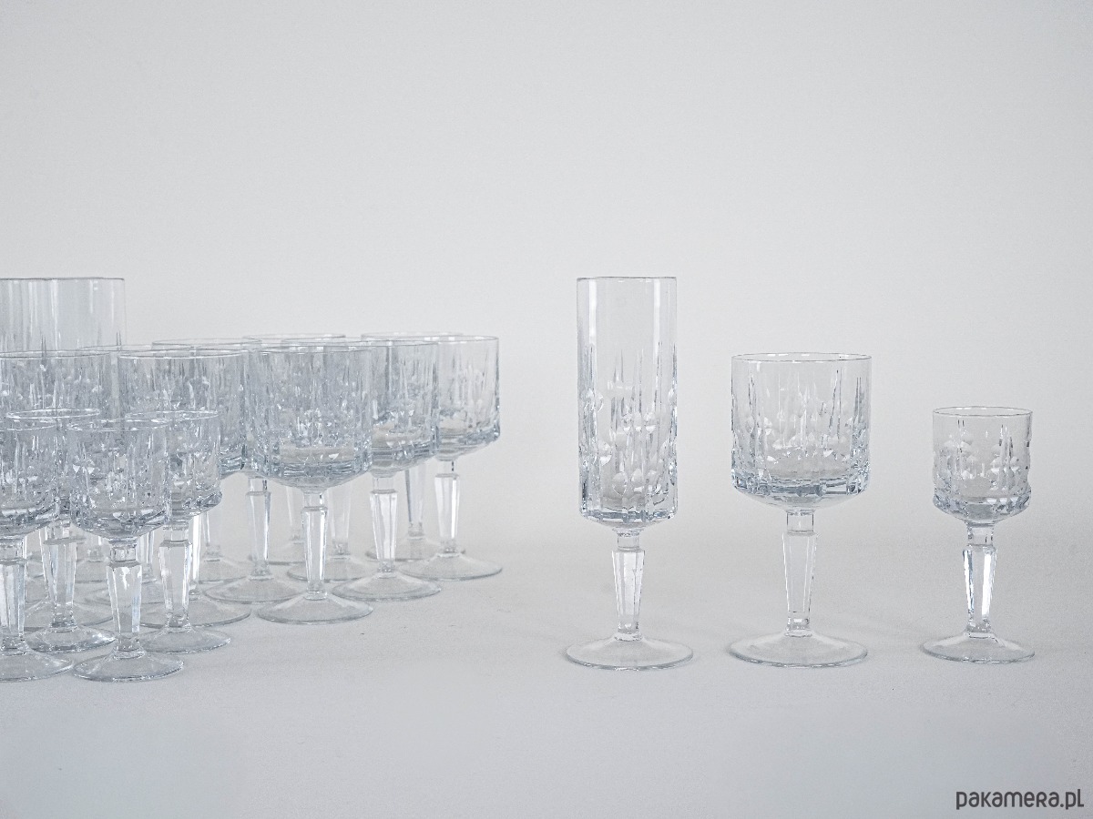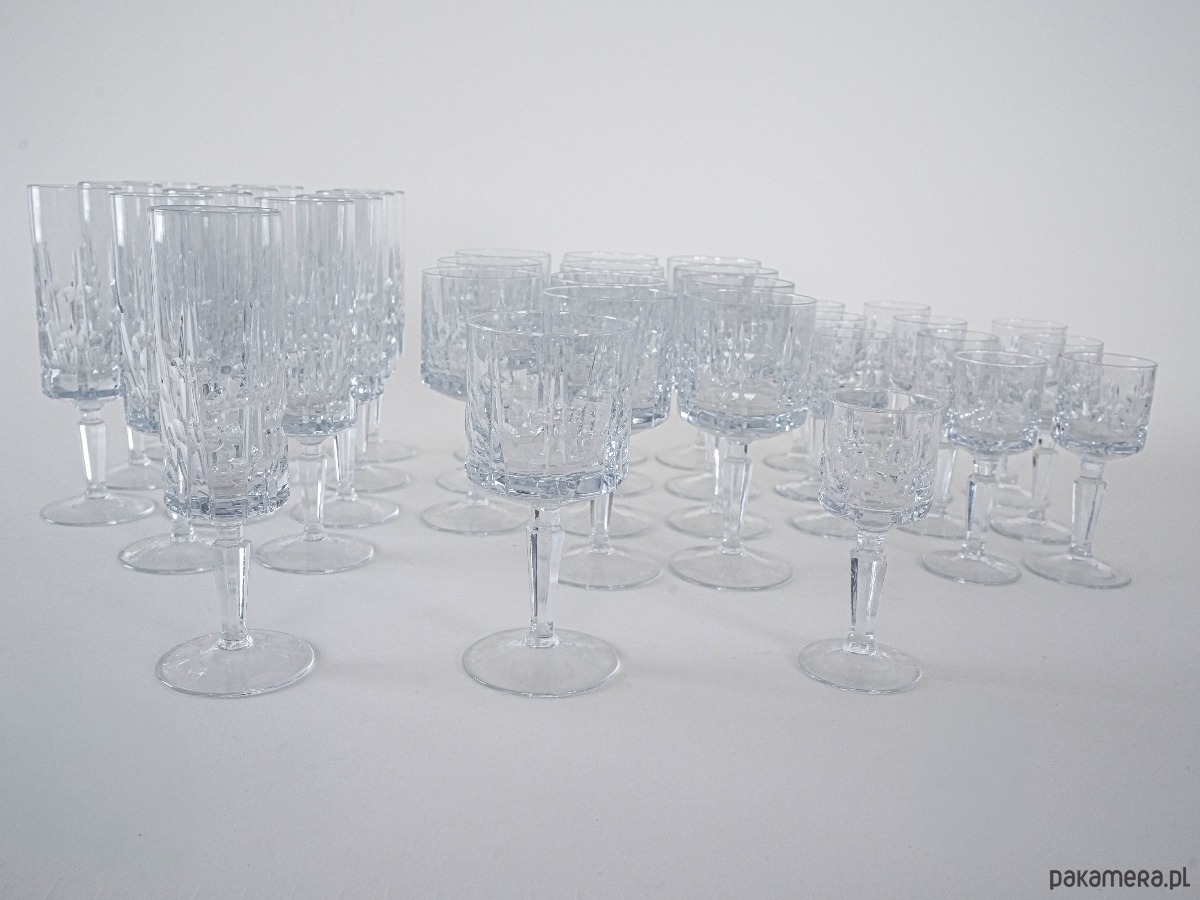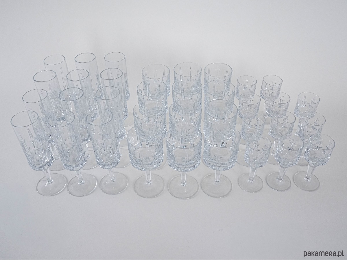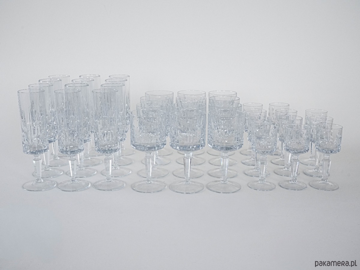 Elegancki kryształowy zestaw kieliszków: 12 do szampana, 12 do wina i 11 do likieru – razem aż 35 sztuk w klasycznym stylu vintage. Subtelne szlify i solidna forma sprawiają, że to wyjątkowa kolekcja na specjalne okazje lub do stylowej jadalni.