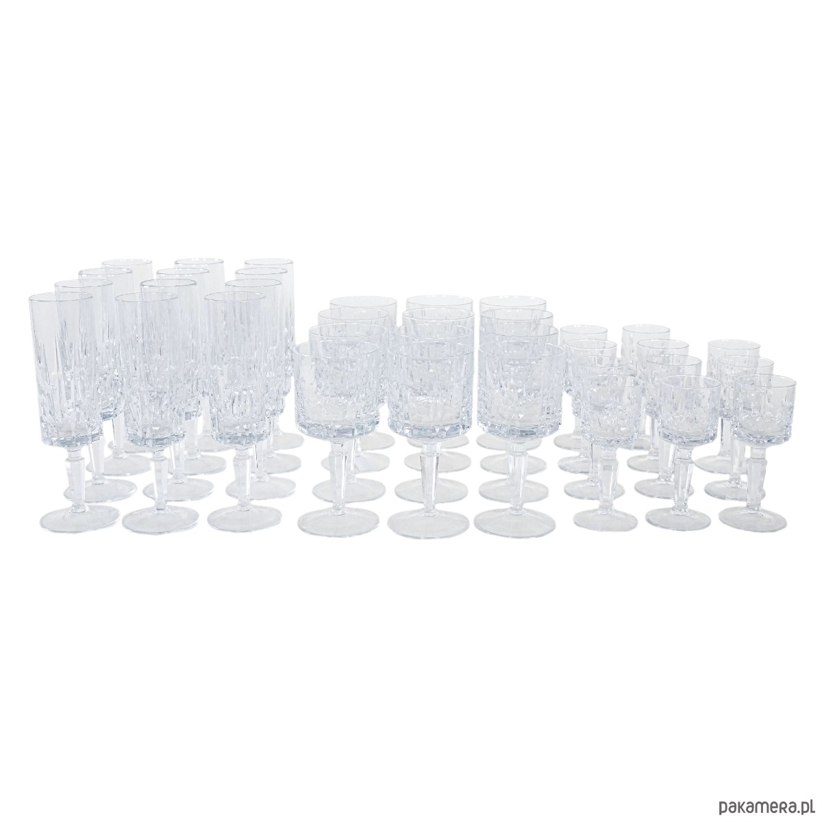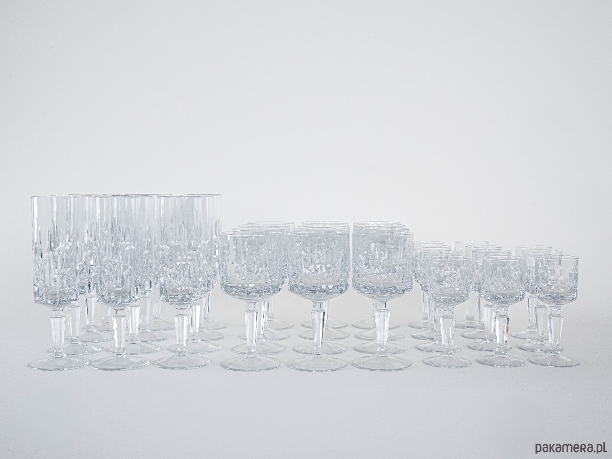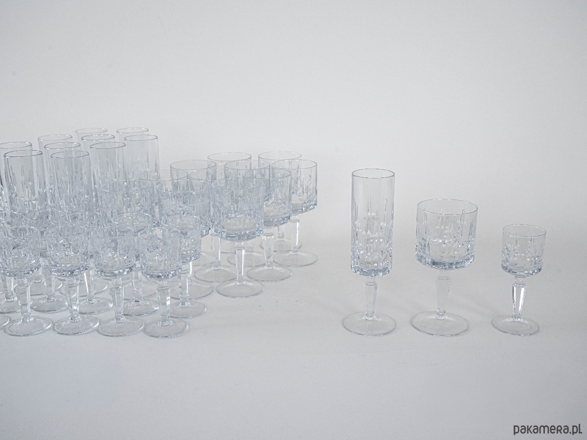 Elegancki kryształowy zestaw kieliszków: 12 do szampana, 12 do wina i 11 do likieru – razem aż 35 sztuk w klasycznym stylu vintage. Subtelne szlify i solidna forma sprawiają, że to wyjątkowa kolekcja na specjalne okazje lub do stylowej jadalni.