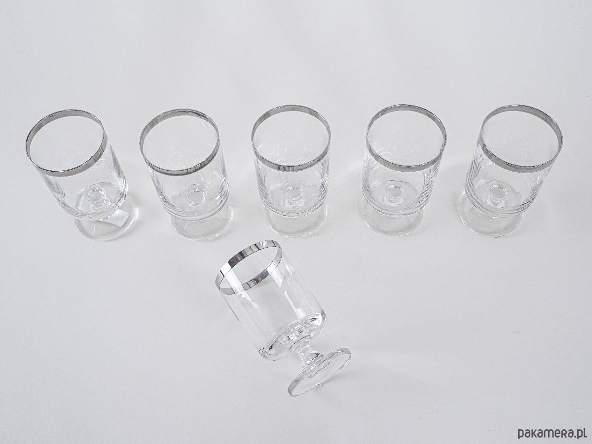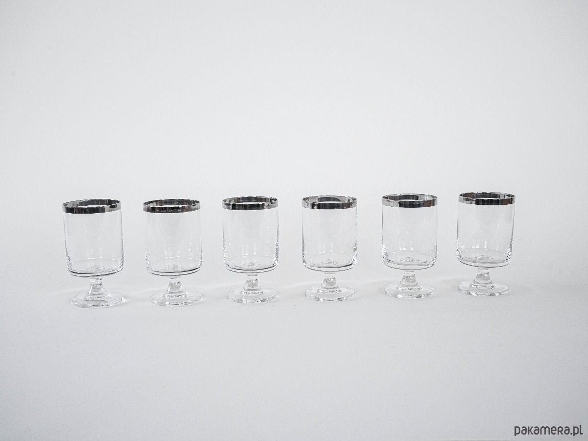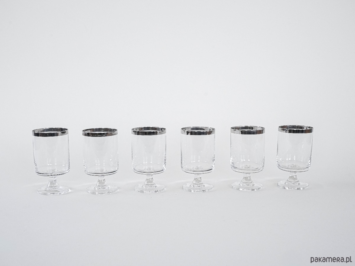 Komplet 6 kieliszków na nodze z lat 60./70., z charakterystycznym srebrnym rantem – minimalistyczna elegancja w stylu Hollywood Regency. Inspirowane projektami marki Dorothy Thorpe, znanej z charakterystycznych metalizowanych obrzeży.