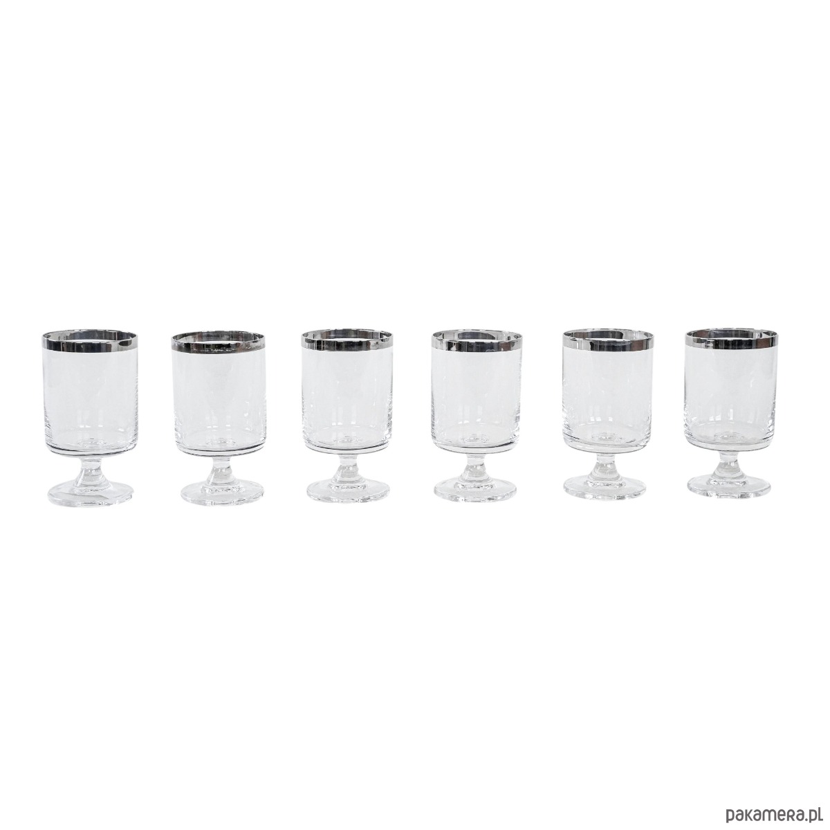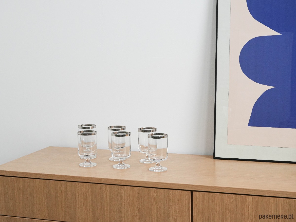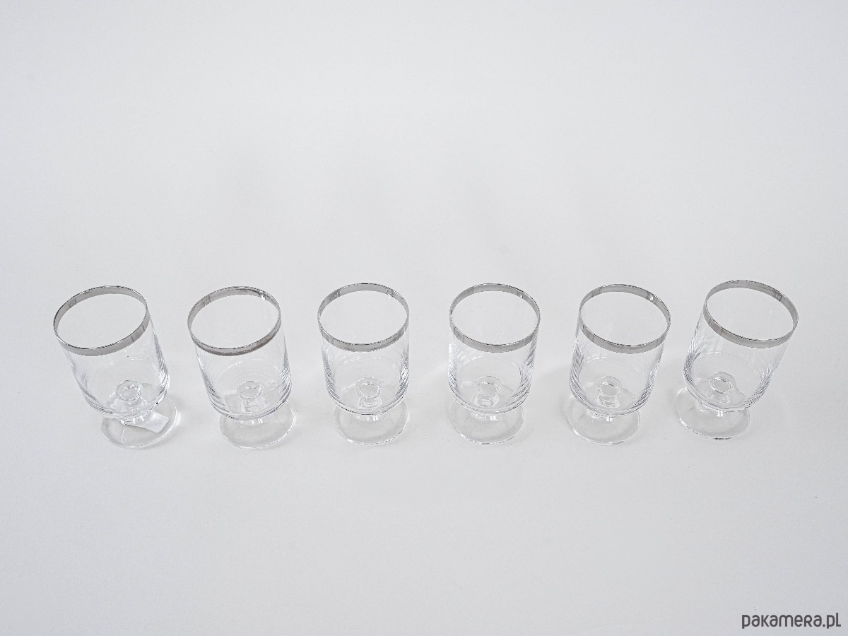 Komplet 6 kieliszków na nodze z lat 60./70., z charakterystycznym srebrnym rantem – minimalistyczna elegancja w stylu Hollywood Regency. Inspirowane projektami marki Dorothy Thorpe, znanej z charakterystycznych metalizowanych obrzeży.