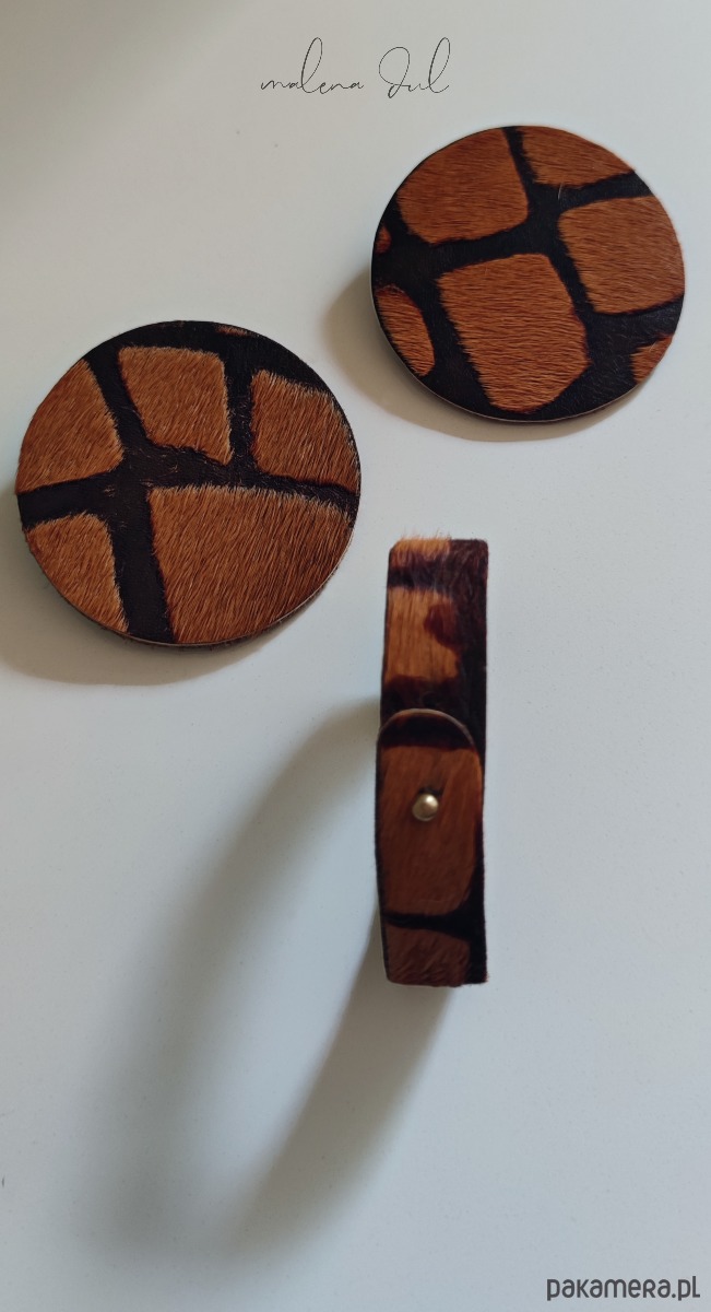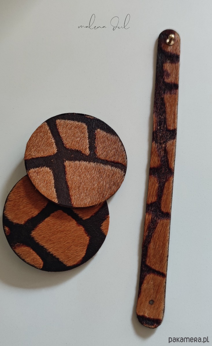 Zestaw wykonany z brązowo - pomarańczowej skóry z włosem - motyw zwierzęcy - żyrafa