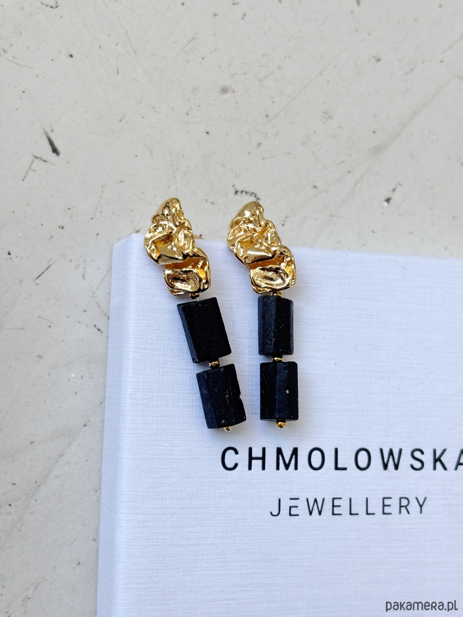 Kolczyki wykonane są z zapięć z mosiądzu pozłacanego 18k złotem oraz turmalinu czarnego surowego.