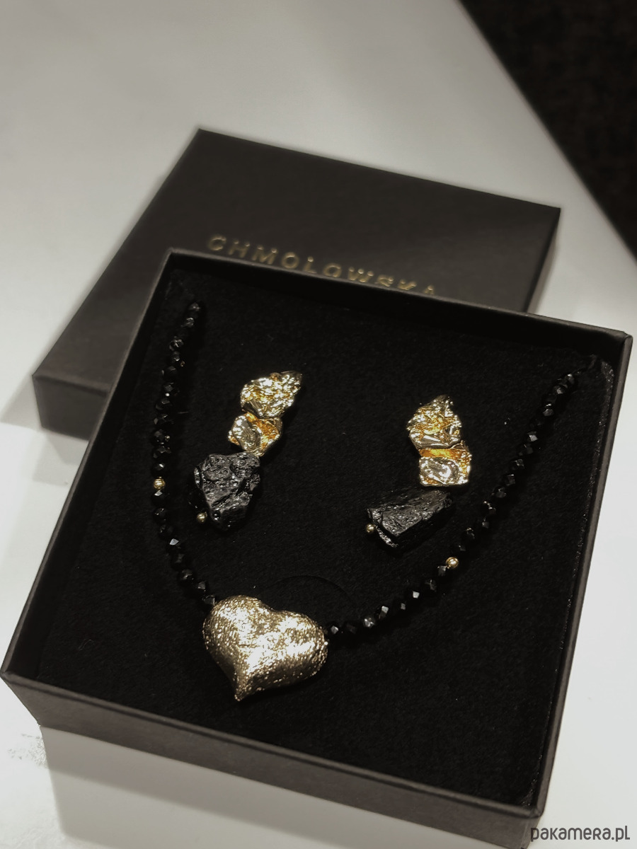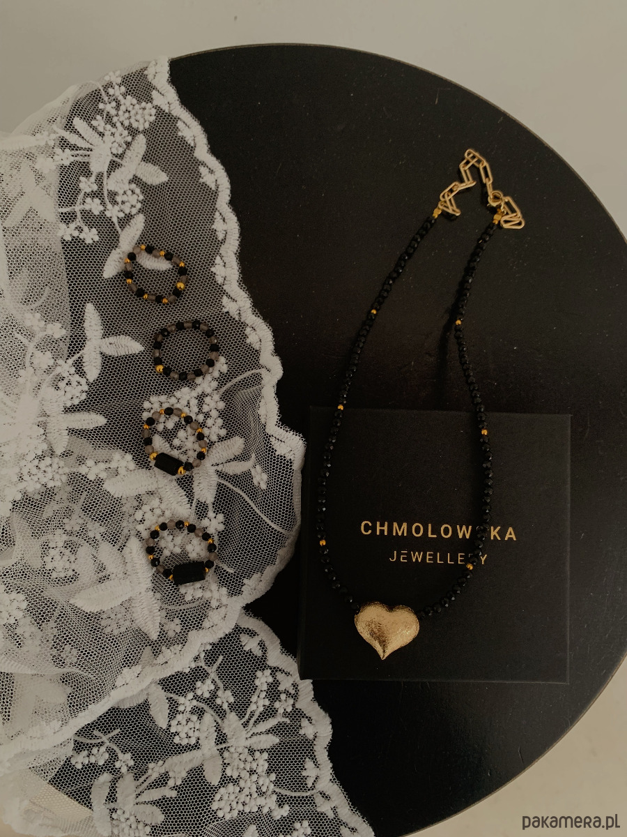 Naszyjnik wykonany jest na lince jubilerskiej z użyciem onyksu oraz zawieszki w kształcie serca, zapięcie wykonane jest ze stali ch.