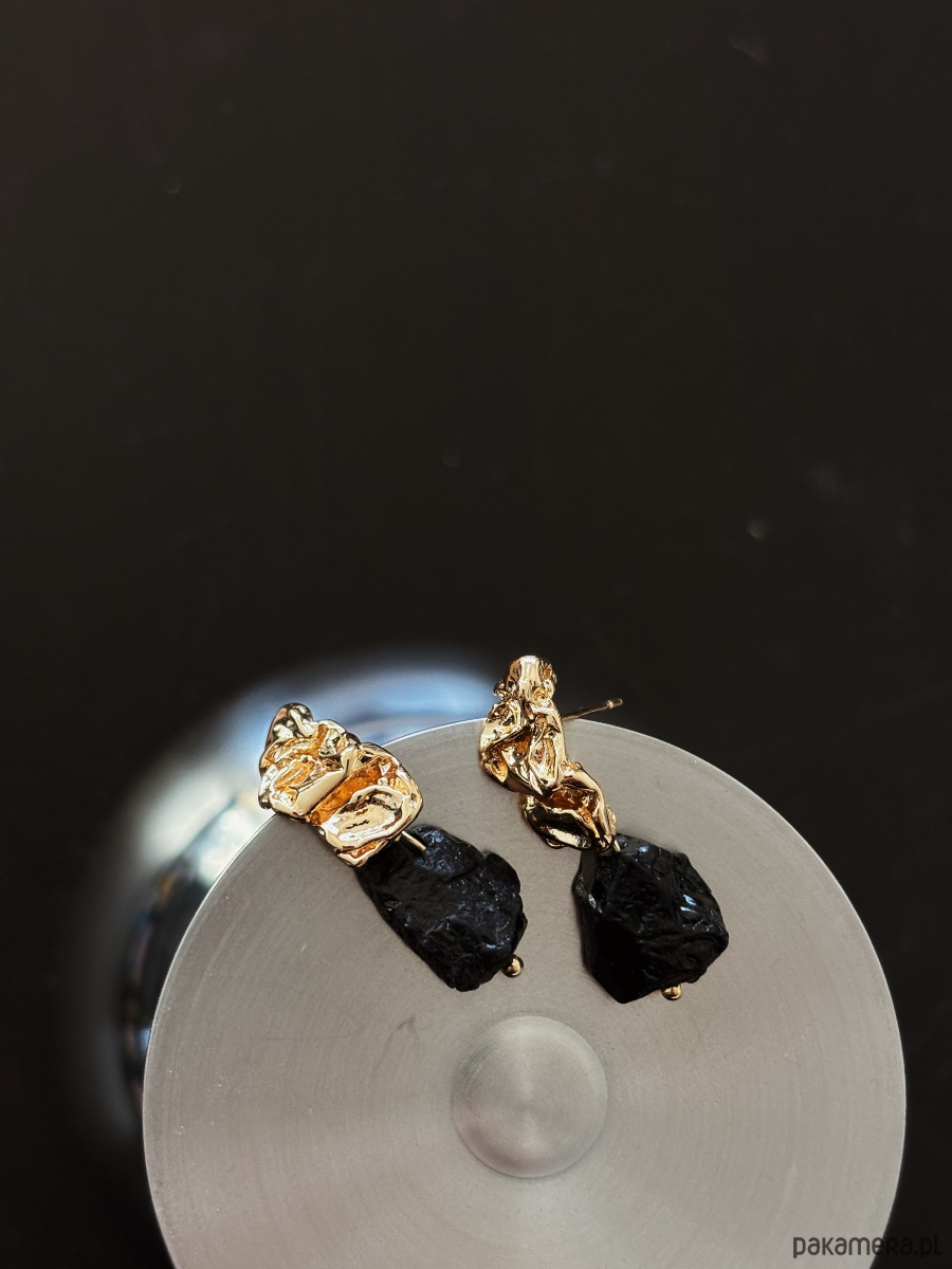 Kolczyki wykonane są z zapięć z mosiądzu pozłacanego 18k złotem oraz turmalinu czarnego surowego.