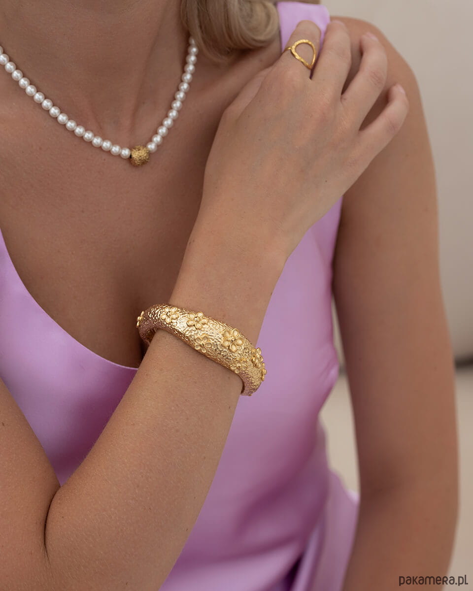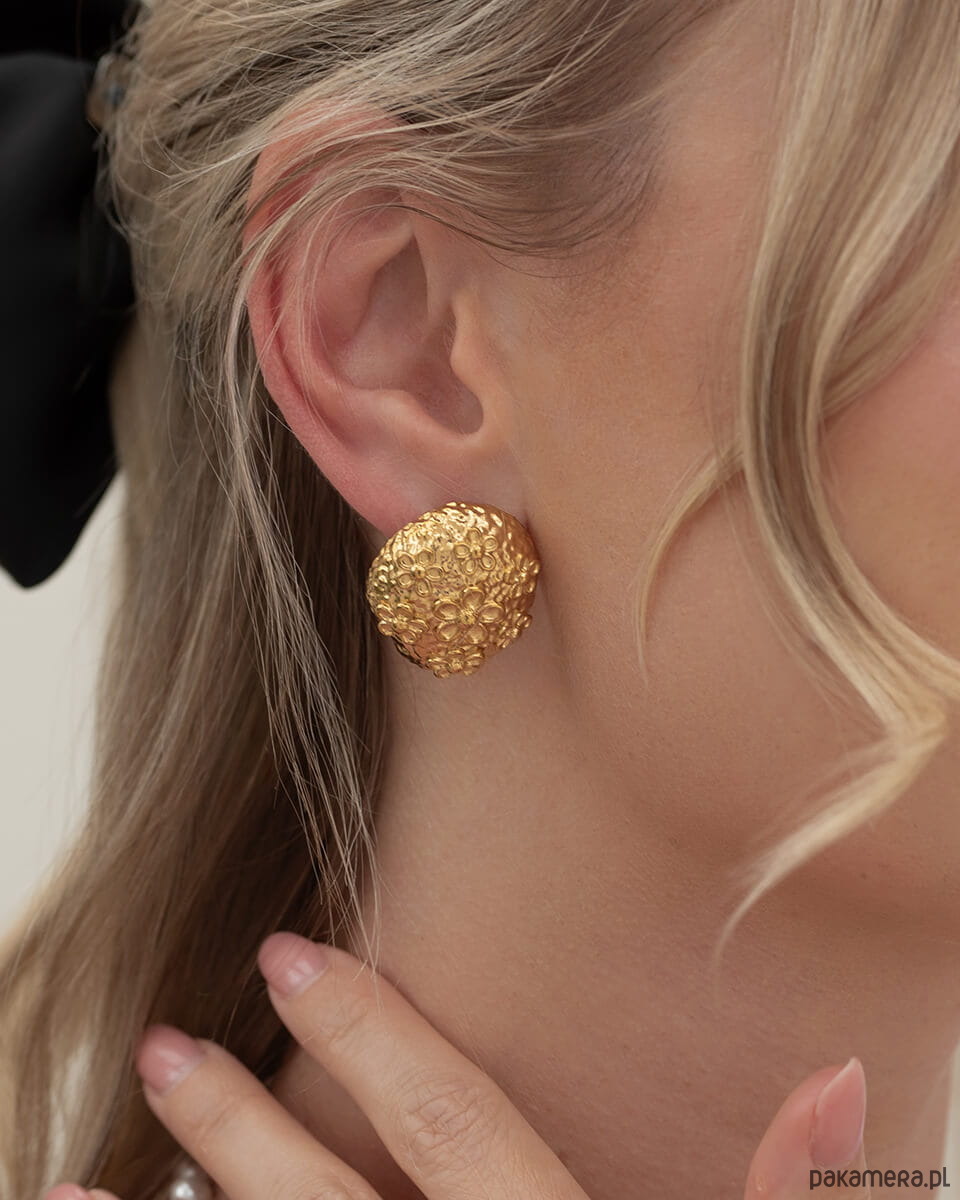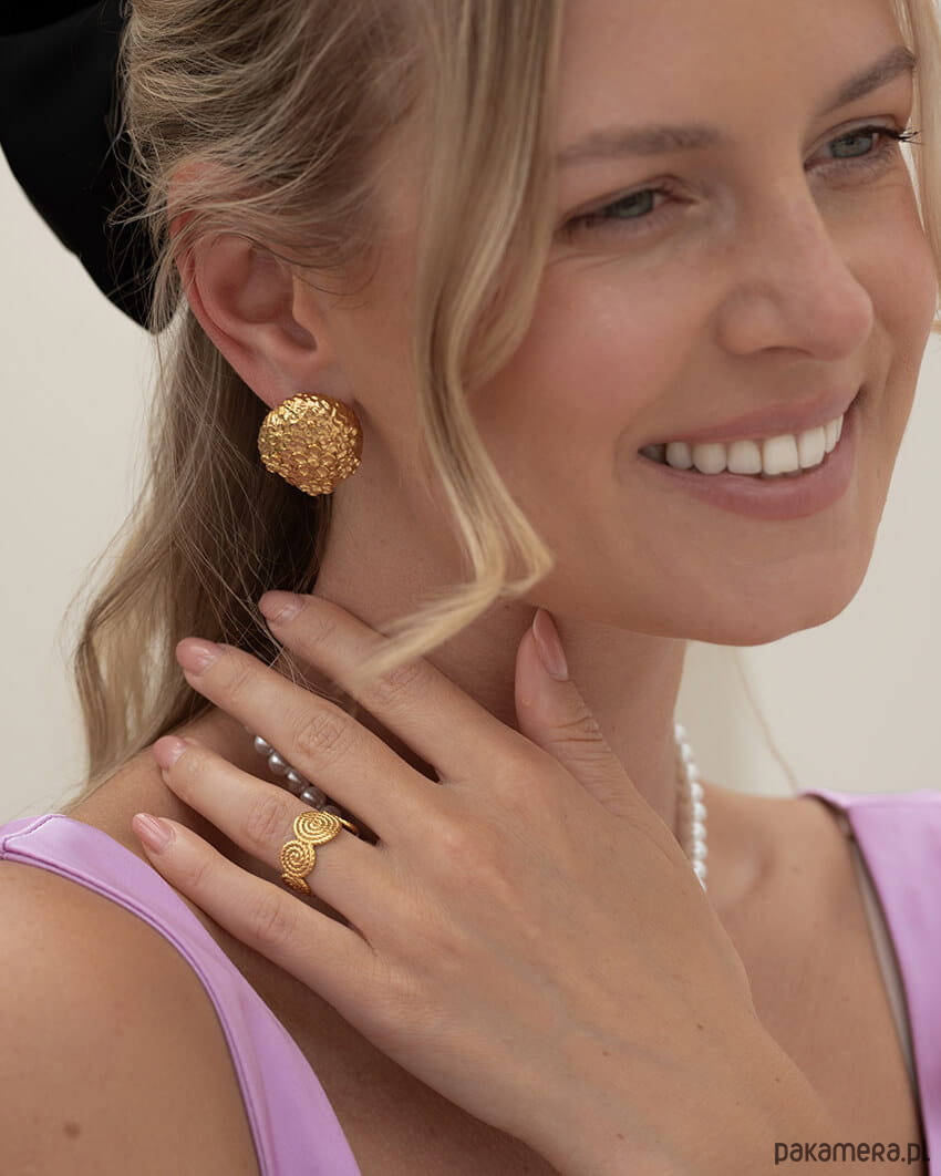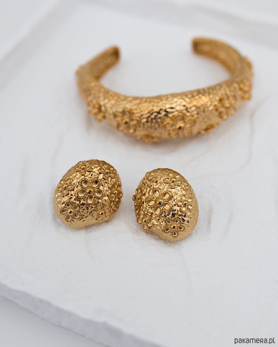 Piękny zestaw biżuterii na wakacje. Złote kolczyki o wyjątkowej fakturze i modowa bransoletka tworzą zjawiskowy zestaw, który przyciąga spojrzenia.