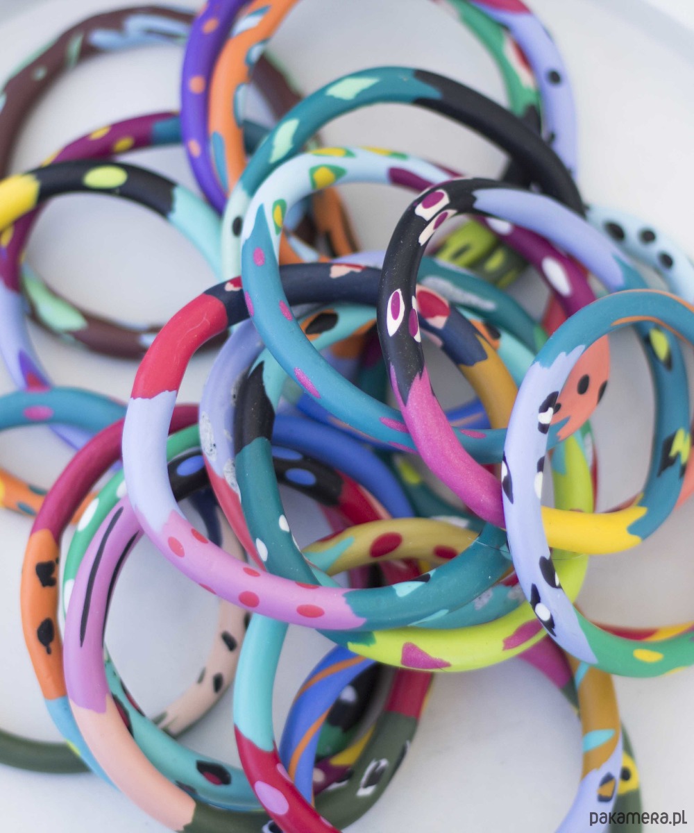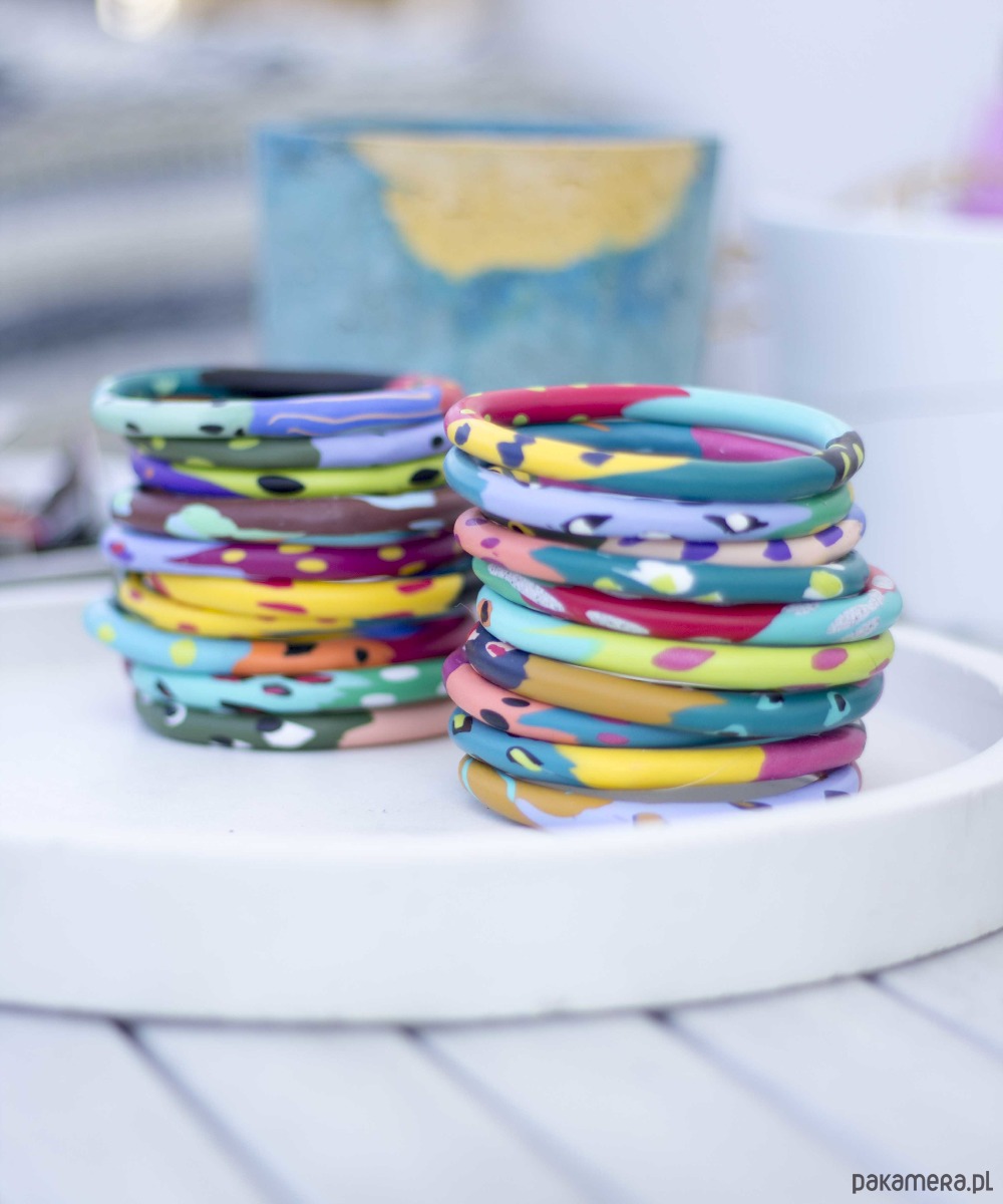 Zestaw 5 losowo wybranych, kolorowych, niepowtarzalnych bransolet, wykonanych z profesjonalnej, trwałej glinki polimerowej marki Fimo, Cernit i Pardo. Wyglądają bardzo efektownie zarówno w stylizacjach letnich jak zimowych. Pasują na rękę dorosłej osoby.