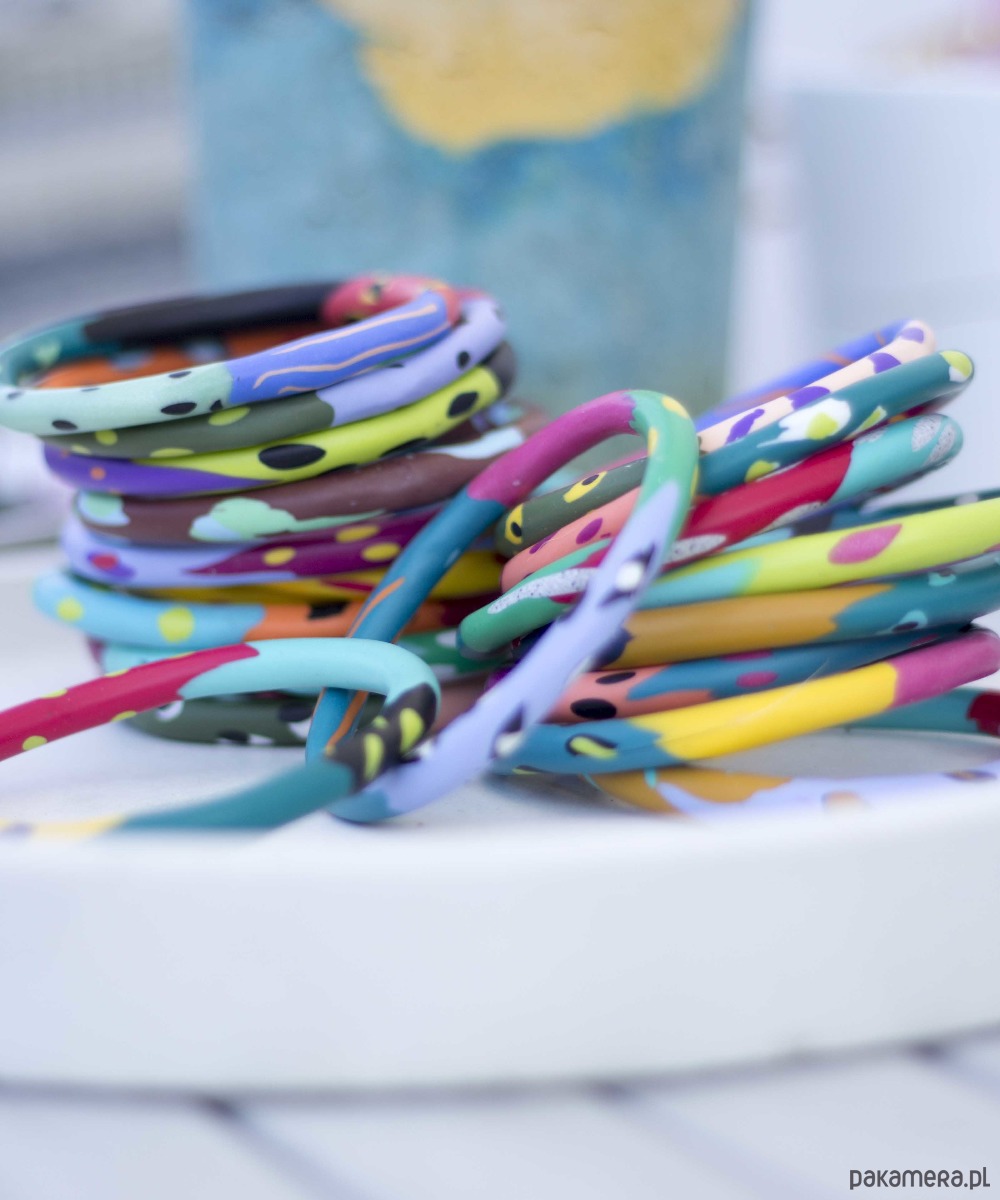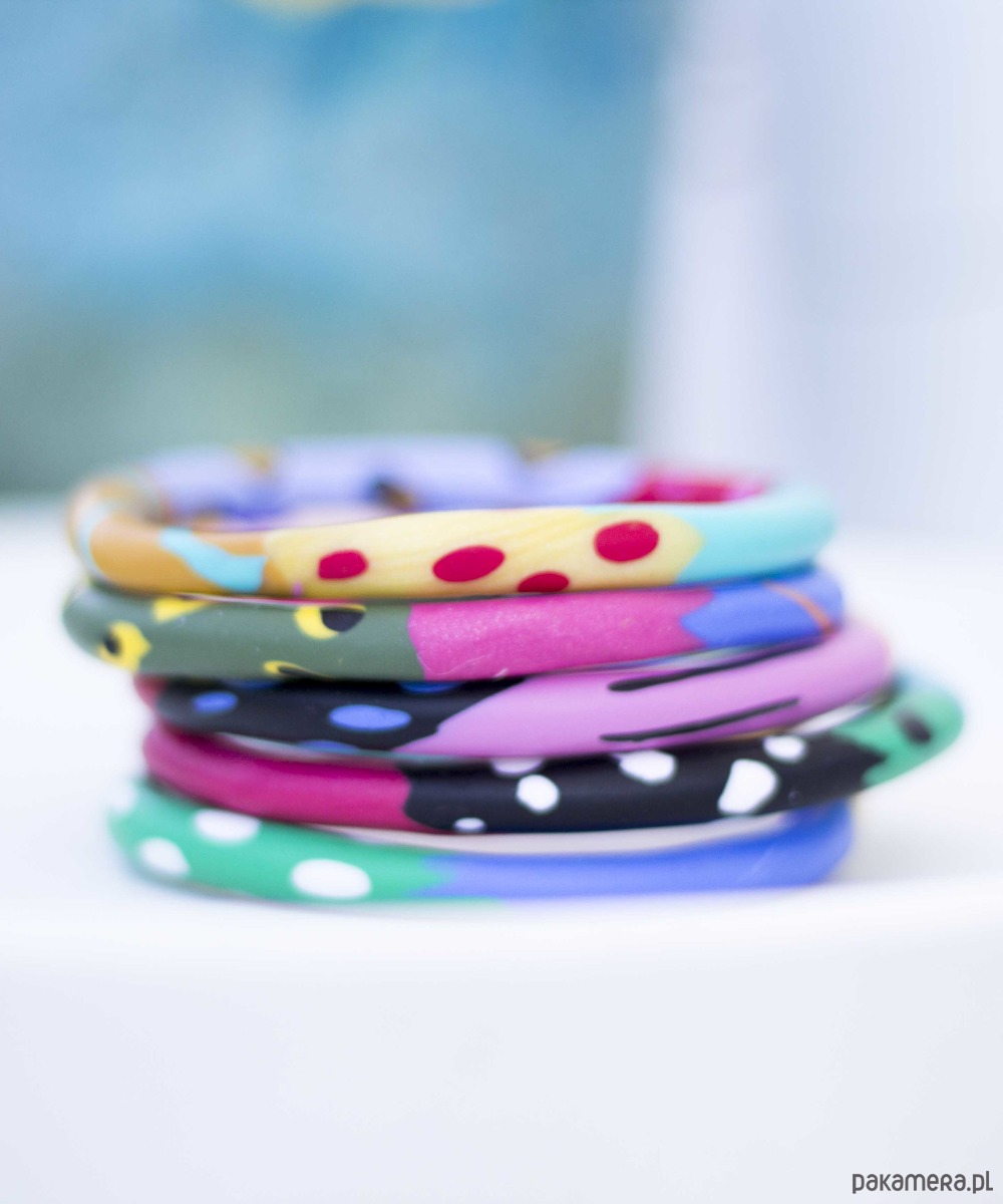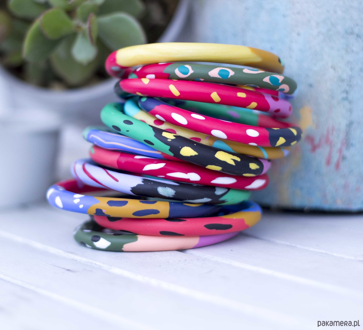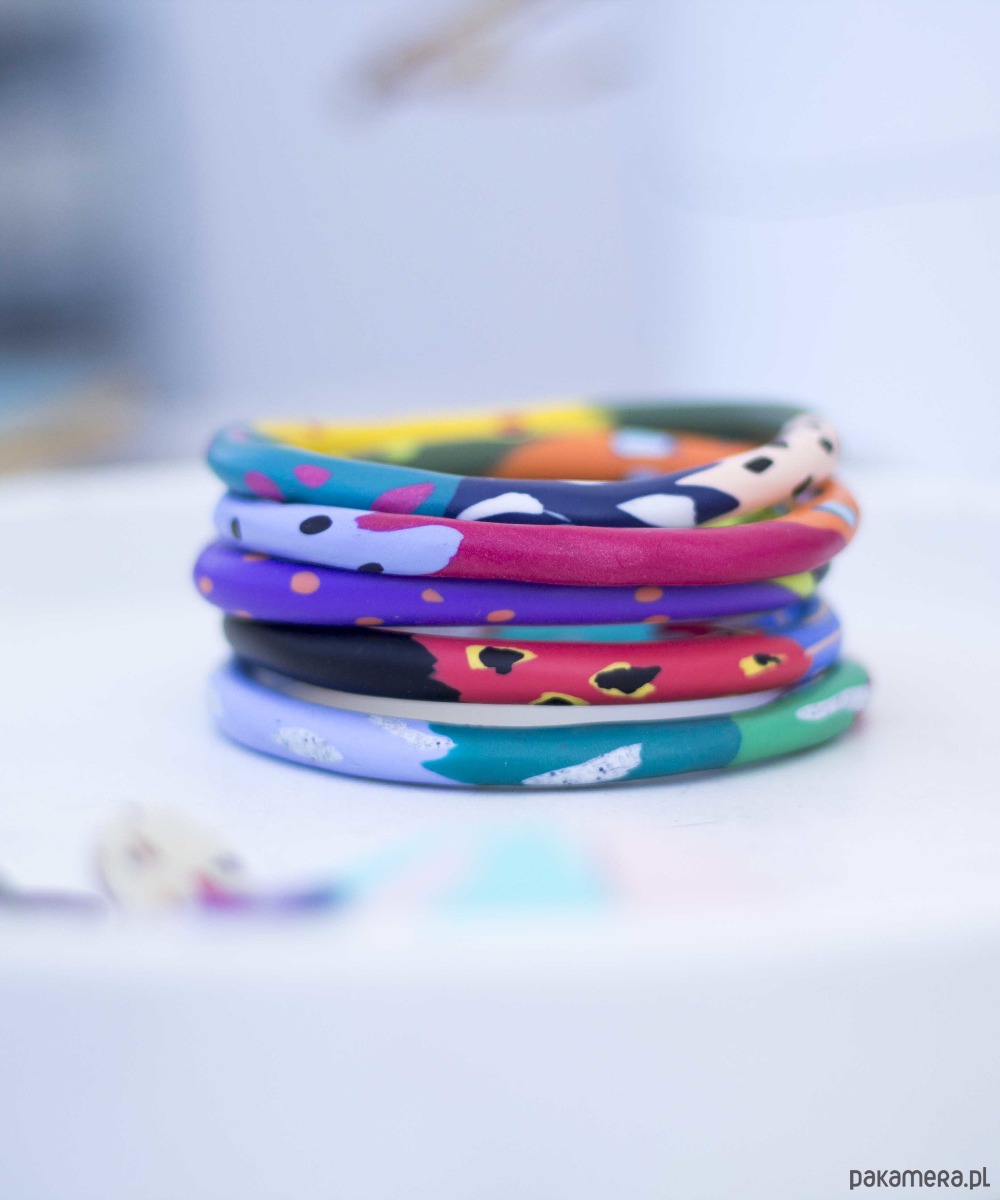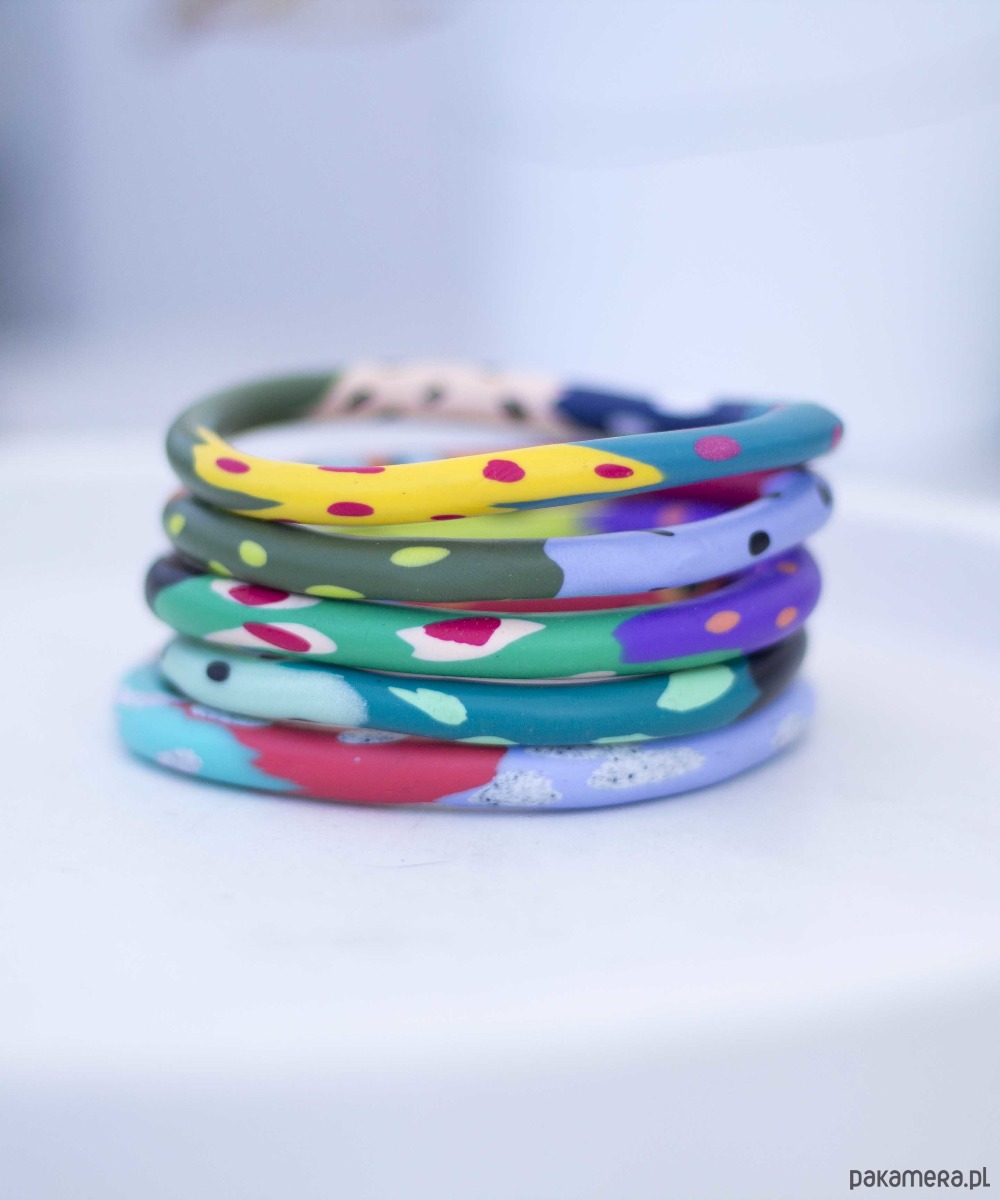 Zestaw 5 losowo wybranych, kolorowych, niepowtarzalnych bransolet, wykonanych z profesjonalnej, trwałej glinki polimerowej marki Fimo, Cernit i Pardo. Wyglądają bardzo efektownie zarówno w stylizacjach letnich jak zimowych. Pasują na rękę dorosłej osoby.
