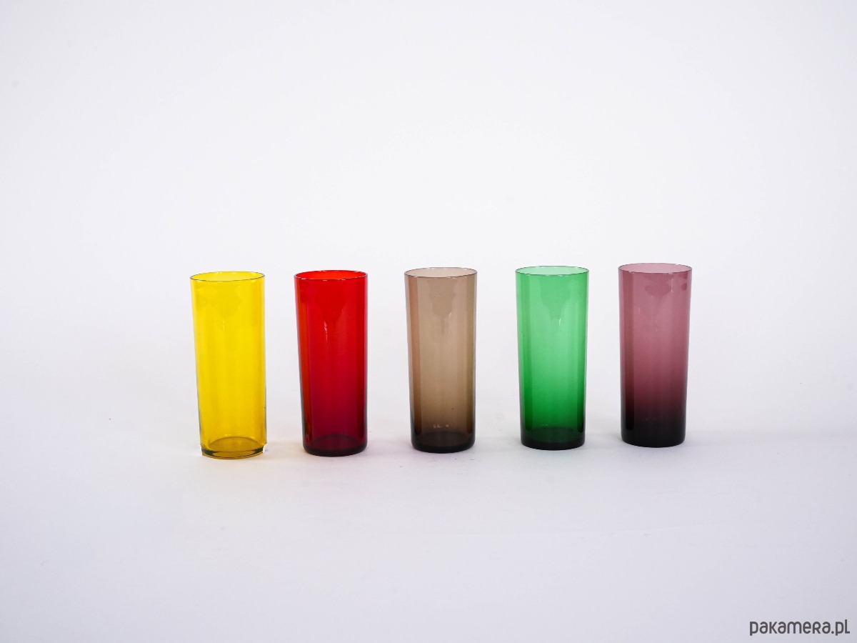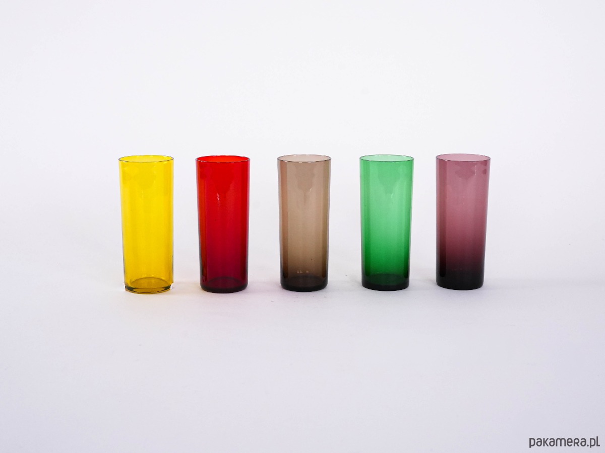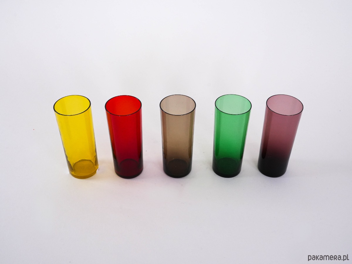 Zestaw kolorowych szklanek wykonany został w latach 60-tych, produkcja włoska.