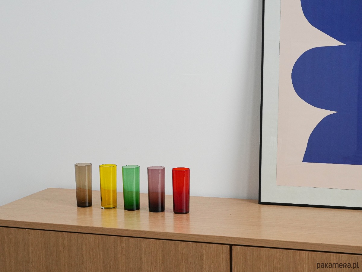Komplet 5 wysokich szklanek z barwionego szkła w intensywnych, głębokich kolorach – każdy egzemplarz w innym odcieniu. Idealne do drinków, soków lub wody – w stylu vintage, ale z nowoczesnym charakterem.