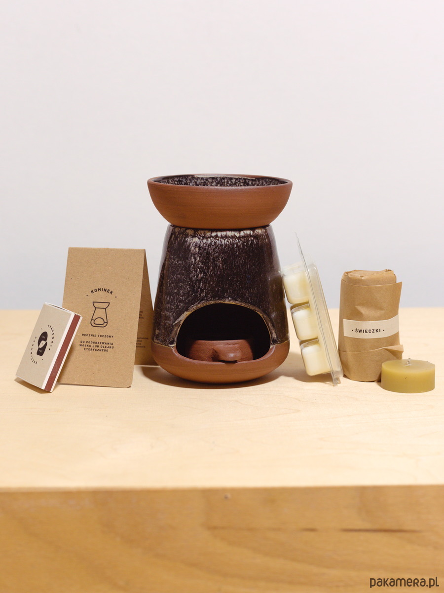 Podaruj komuś bliskiemu zestaw do relaksu składający się z ręcznie toczonego kominka do topienia wosku, naturalnego sojowego wosku zapachowego stworzonego przez Olove lub Cafune i świeczek z wosku pszczelego od Płonka Podleśna.