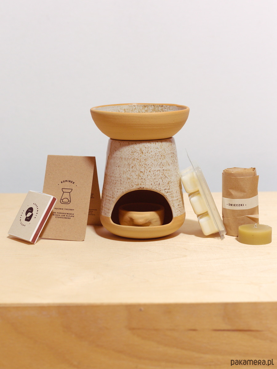 Podaruj komuś bliskiemu zestaw do relaksu składający się z ręcznie toczonego kominka do topienia wosku, naturalnego sojowego wosku zapachowego stworzonego przez Olove lub Cafune i świeczek z wosku pszczelego od Płonka Podleśna.