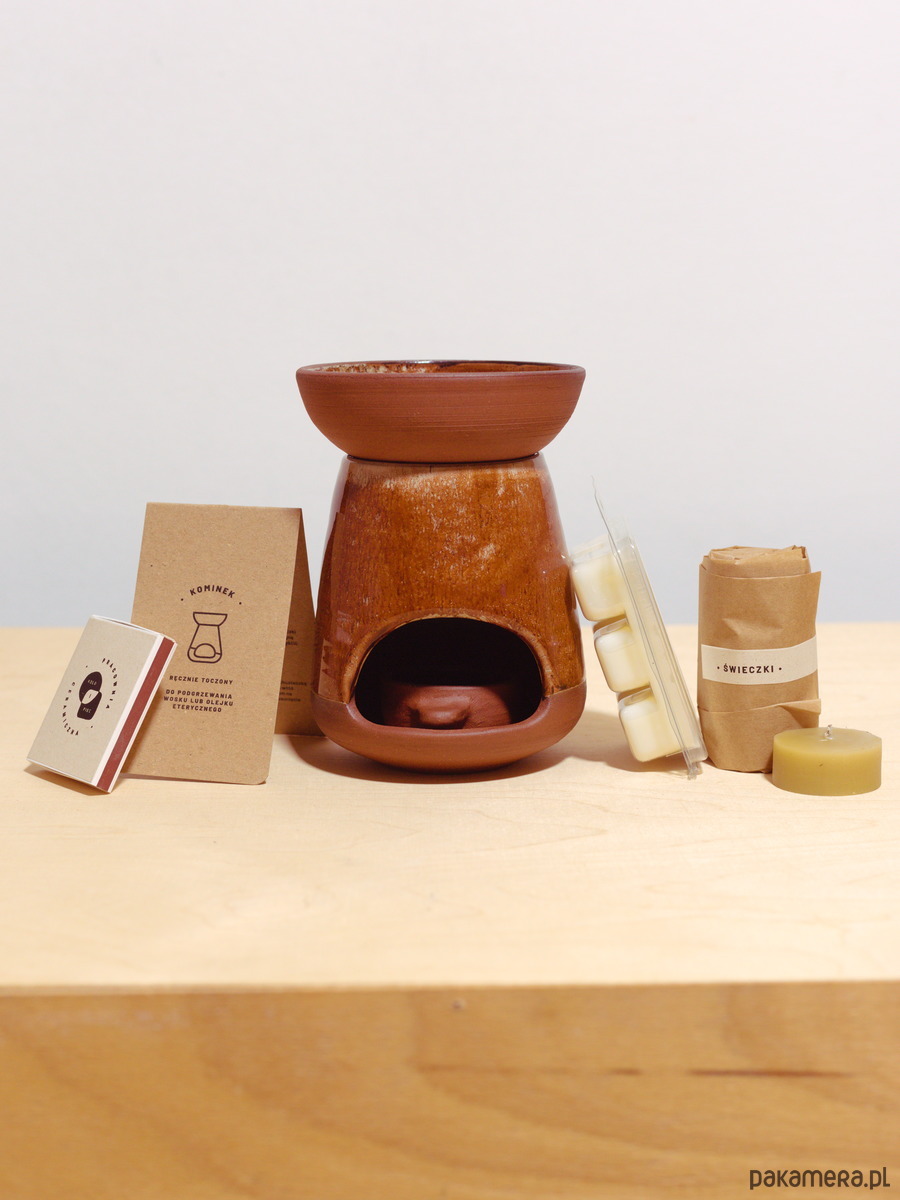 Podaruj komuś bliskiemu zestaw do relaksu składający się z ręcznie toczonego kominka do topienia wosku, naturalnego sojowego wosku zapachowego stworzonego przez Olove lub Cafune i świeczek z wosku pszczelego od Płonka Podleśna.