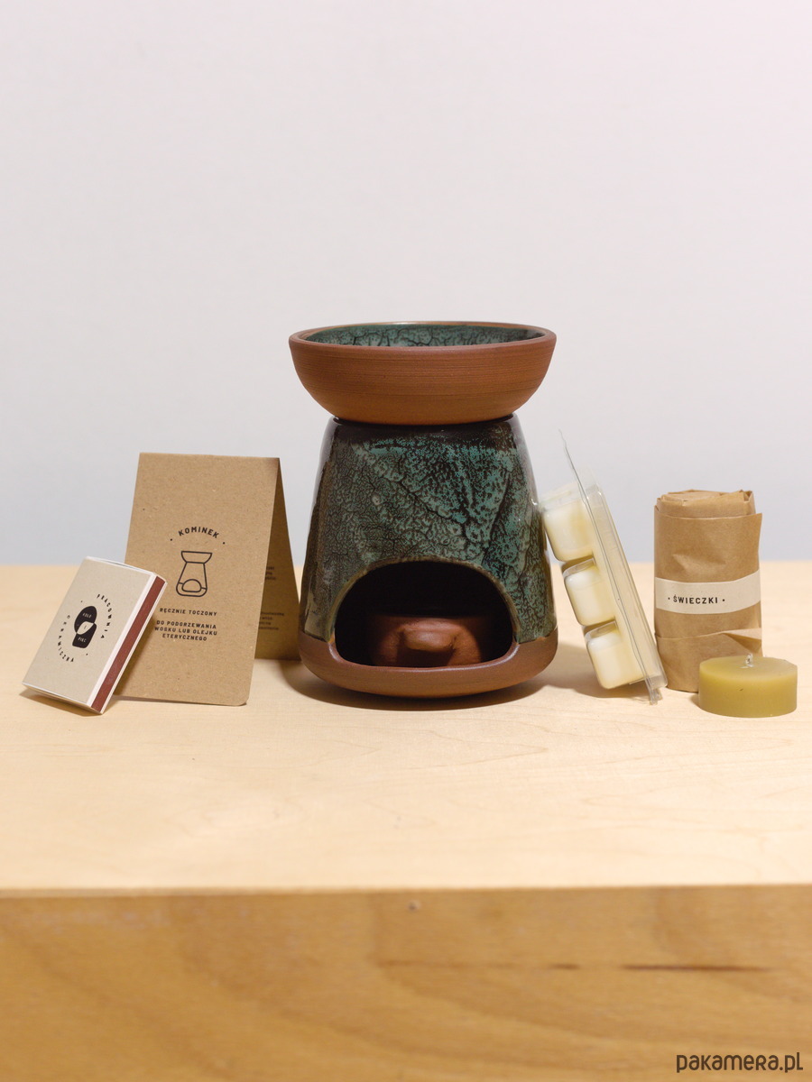 Podaruj komuś bliskiemu zestaw do relaksu składający się z ręcznie toczonego kominka do topienia wosku, naturalnego sojowego wosku zapachowego stworzonego przez Olove lub Cafune i świeczek z wosku pszczelego od Płonka Podleśna.