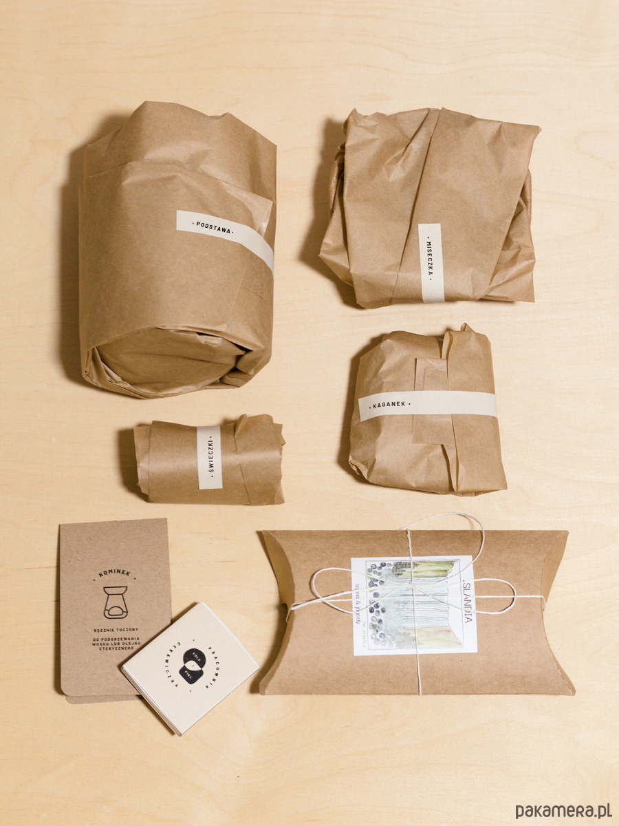 - opakowanie prezentowe - kartonowe pudełko z grubym bawełnianym sznurkiem (ciemno zielonym i kremowym) i karteczką do podpisu. Pudełko zostanie dodatkowo owinięte w brązowy karton dla ochrony. Sznurki i karteczka będą w środku pudełka.