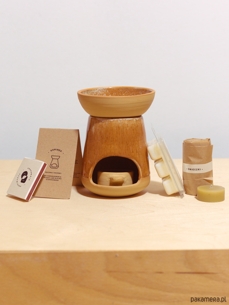 Podaruj komuś bliskiemu zestaw do relaksu składający się z ręcznie toczonego kominka do topienia wosku, naturalnego sojowego wosku zapachowego stworzonego przez Olove lub Cafune i świeczek z wosku pszczelego od Płonka Podleśna.