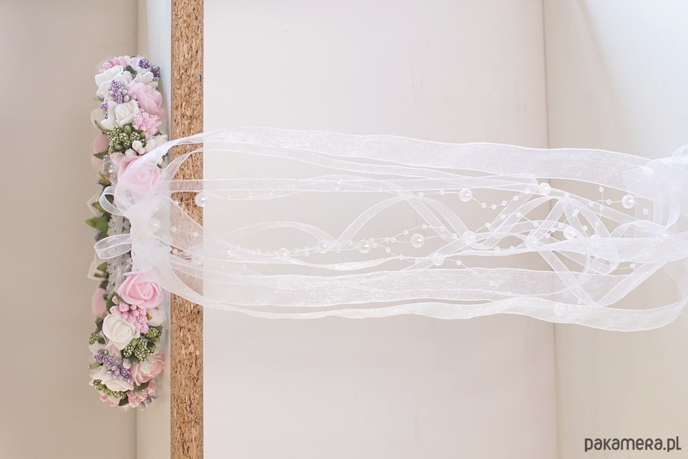Wykonana z białych i różowych kwiatów z dodatkiem zieleni.