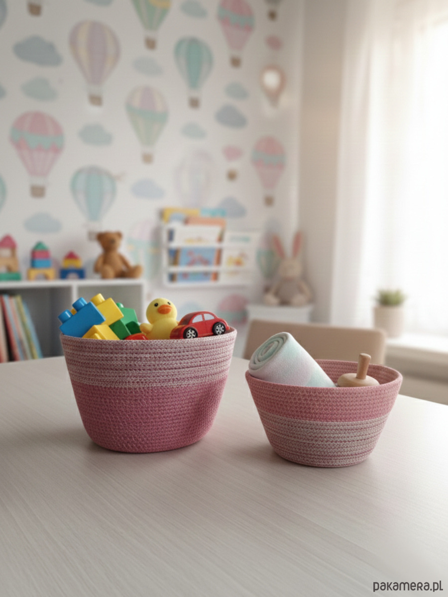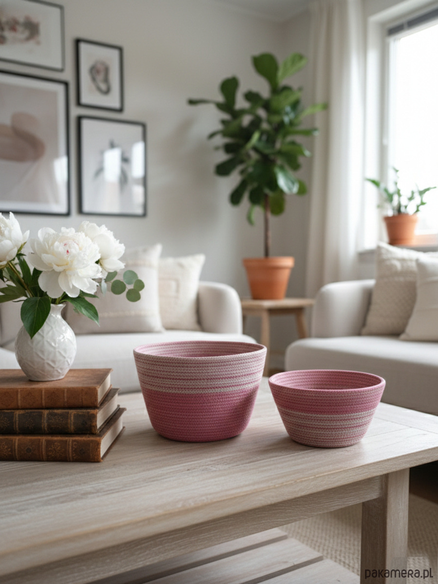 Zestaw koszyków „Różany Spokój” to elegancki duet szyty na maszynie ze sztywnego sznurka bawełnianego w odcieniu brudnego różu i subtelnego melanżu. Większy koszyk oraz mniejszy świetnie sprawdzą się jako dekoracja i organizer w każdym wnętrzu. Stabilne, estetyczne i unikatowe - stworzone w polskiej pracowni z dbałością o każdy szczegół.